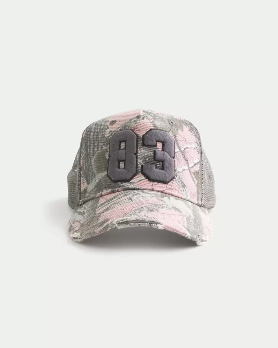 A classic trucker-style hat with a mesh back and pink camo pattern at the front. Number graphic applique, distressed details, adjustable.