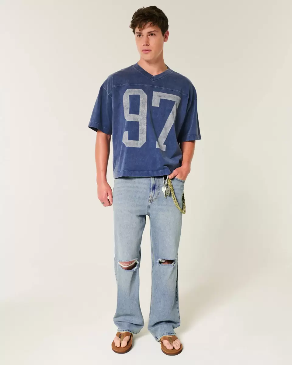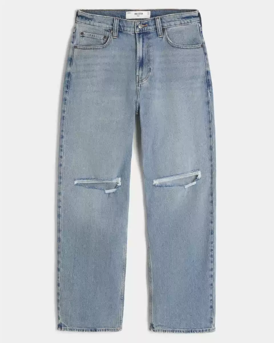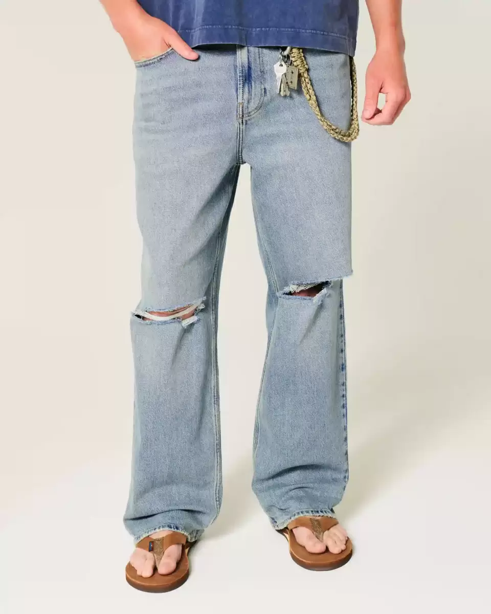 Comfortable denim jeans in a medium wash, designed with a baggy leg. Fading, whiskering, ripped details. Imported.