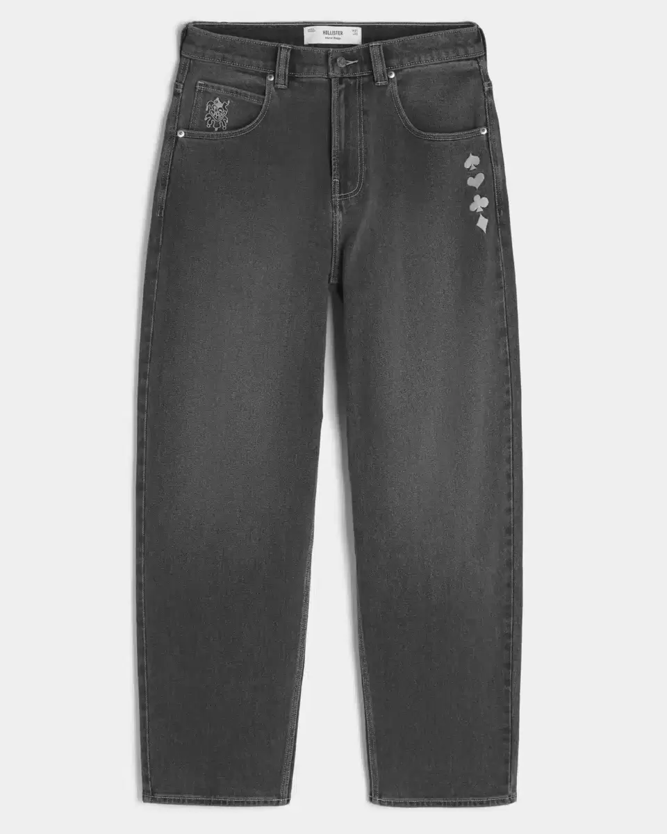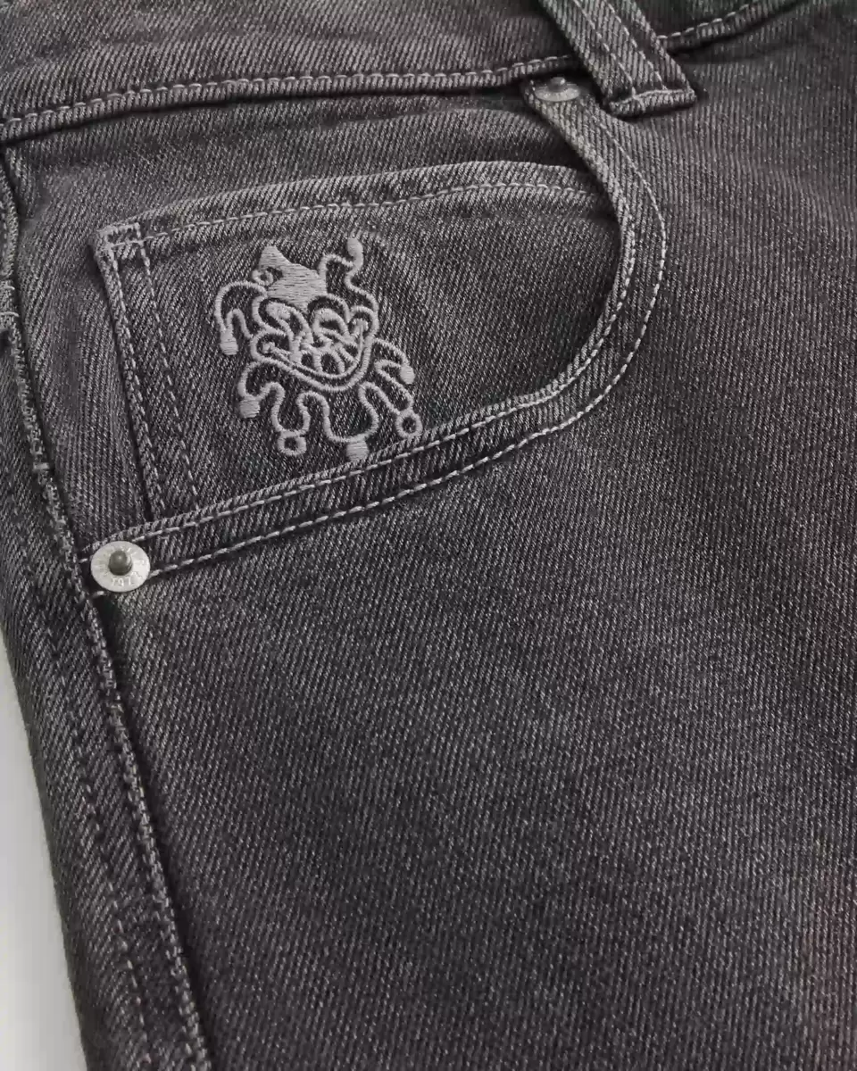 Comfortable denim skater jeans in washed black, designed with a baggy leg. Fading, embroidered playing card suit graphics at the left leg and joker graphic at the right coin pocket. Imported.