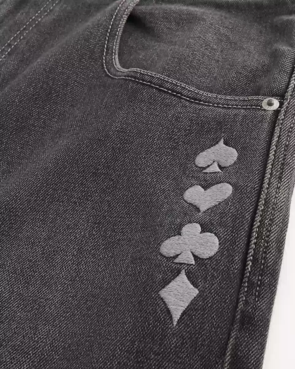 Comfortable denim skater jeans in washed black, designed with a baggy leg. Fading, embroidered playing card suit graphics at the left leg and joker graphic at the right coin pocket