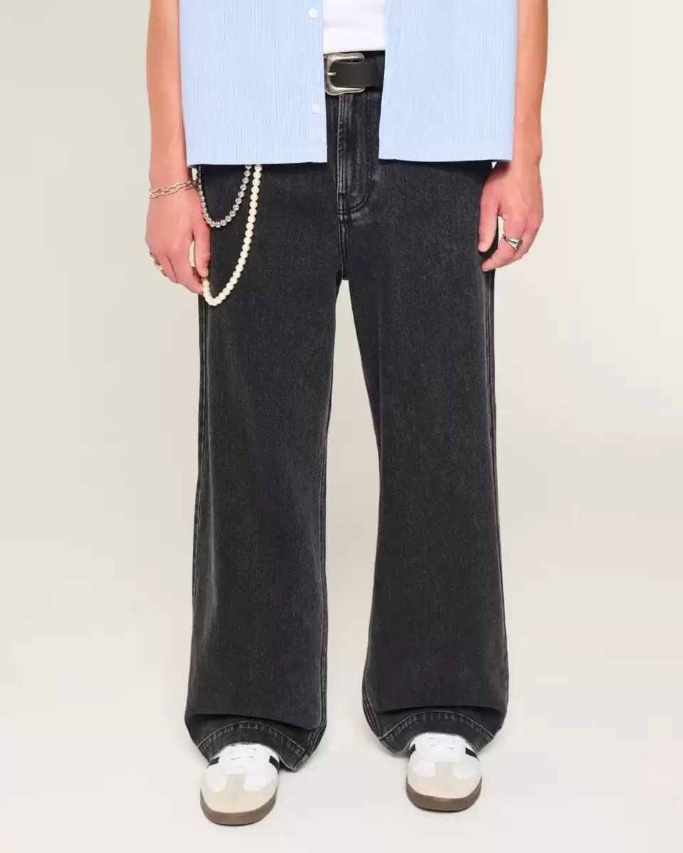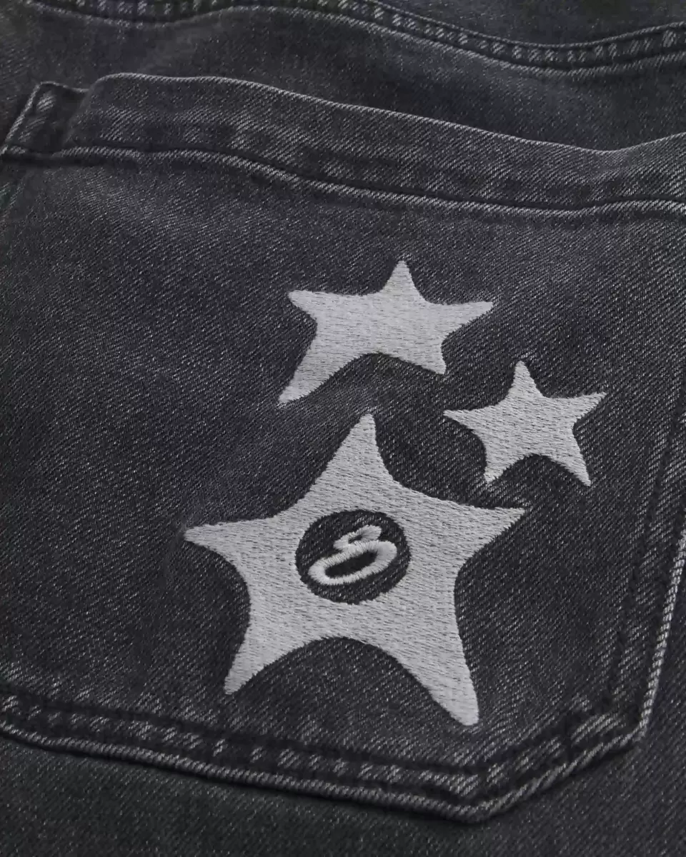 Comfortable denim jeans in washed black, designed with a super baggy leg. Embroidered star graphic at back pocket. Imported.