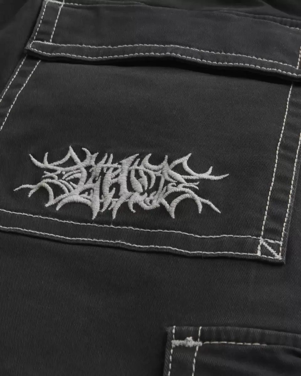 Comfortable twill pants designed with a baggy leg and side cargo pockets. Drawstring waist, contrast stitching. Imported.