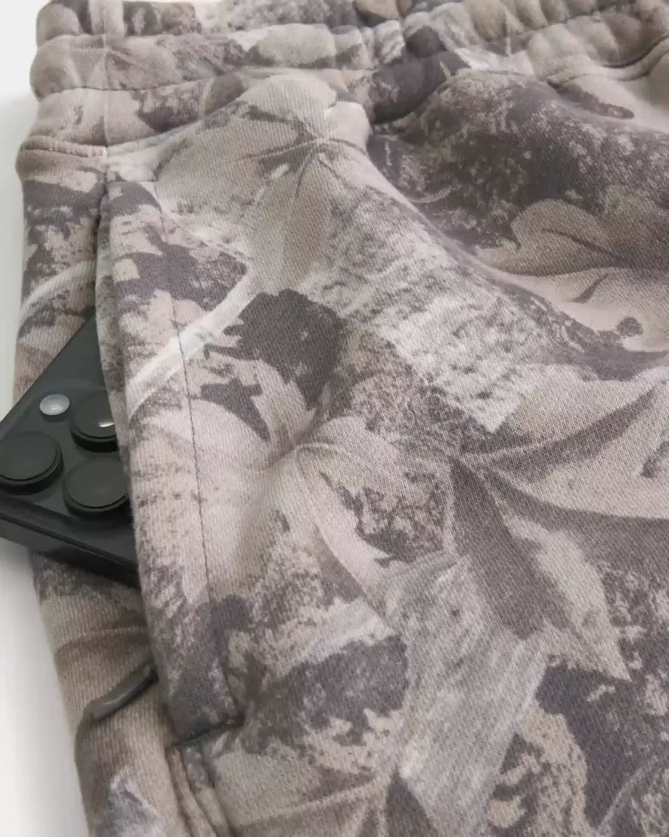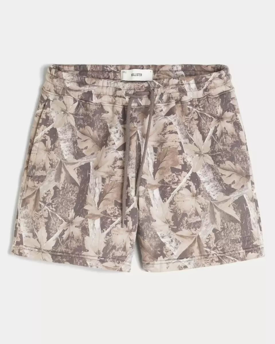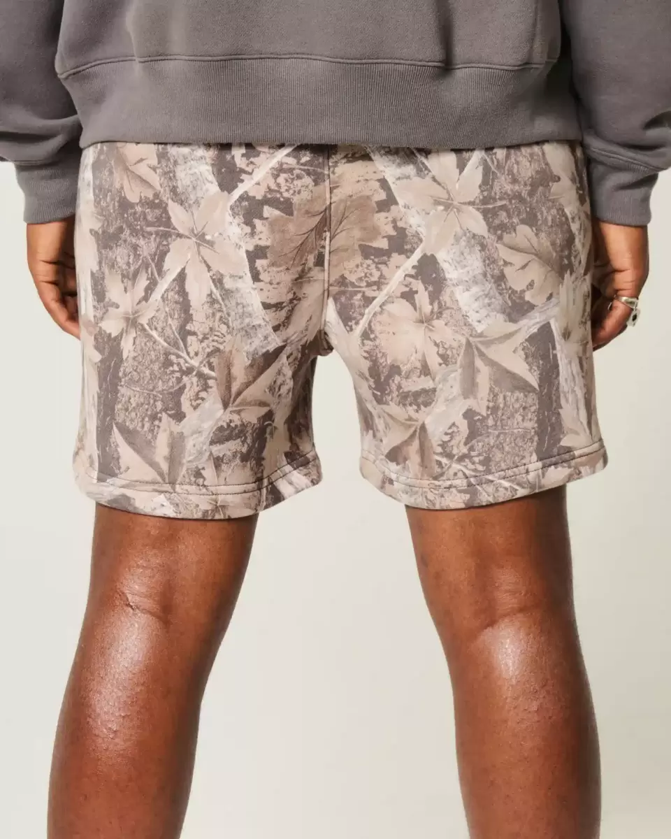 Super soft fleece shorts that hit mid-thigh, featuring an all-over camo pattern and right zipper pocket. Drawstring waist, loose fit. Imported.