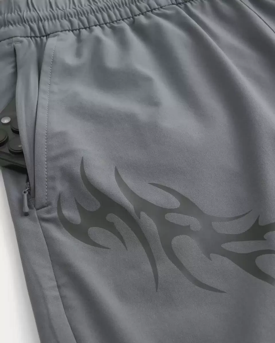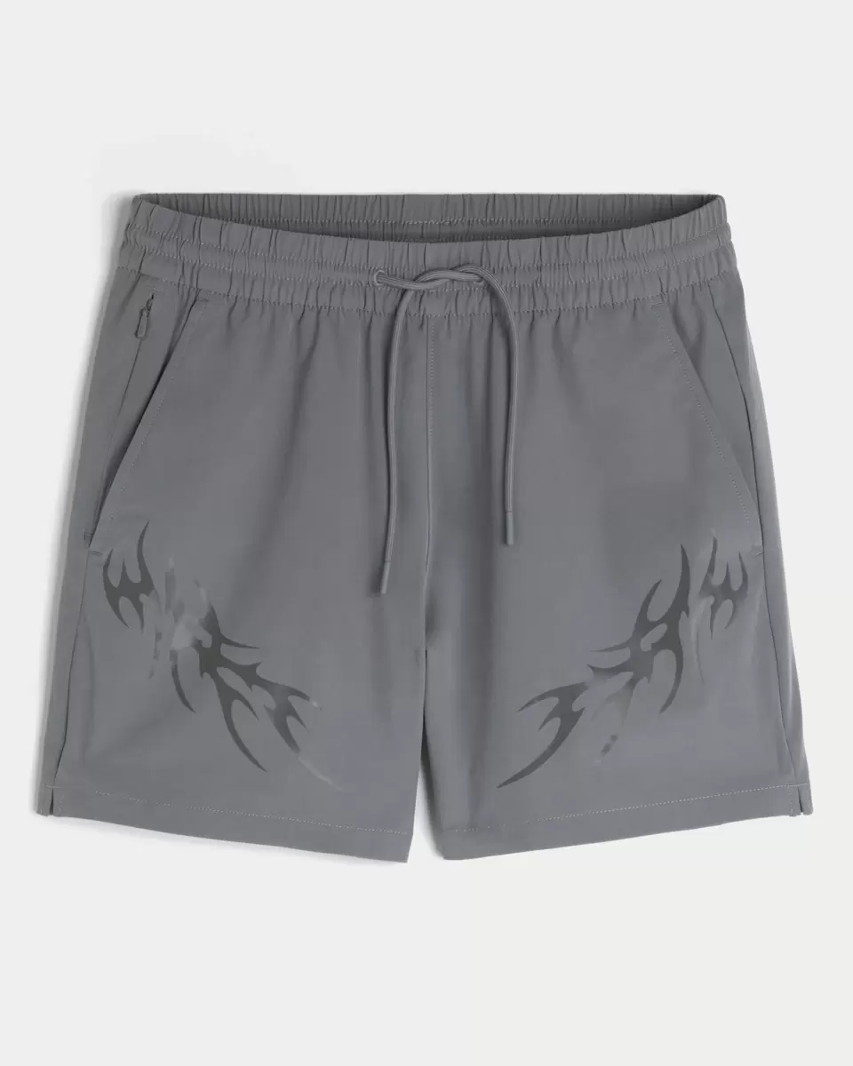 Comfortable active shorts with stretch, designed with a mid-thigh length and drawstring waist. Graphics, right zipper pocket, pockets. Imported.