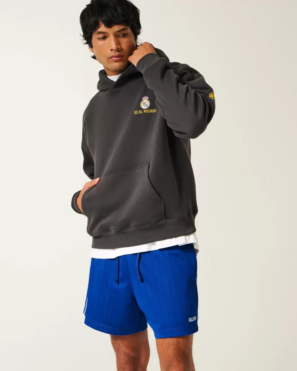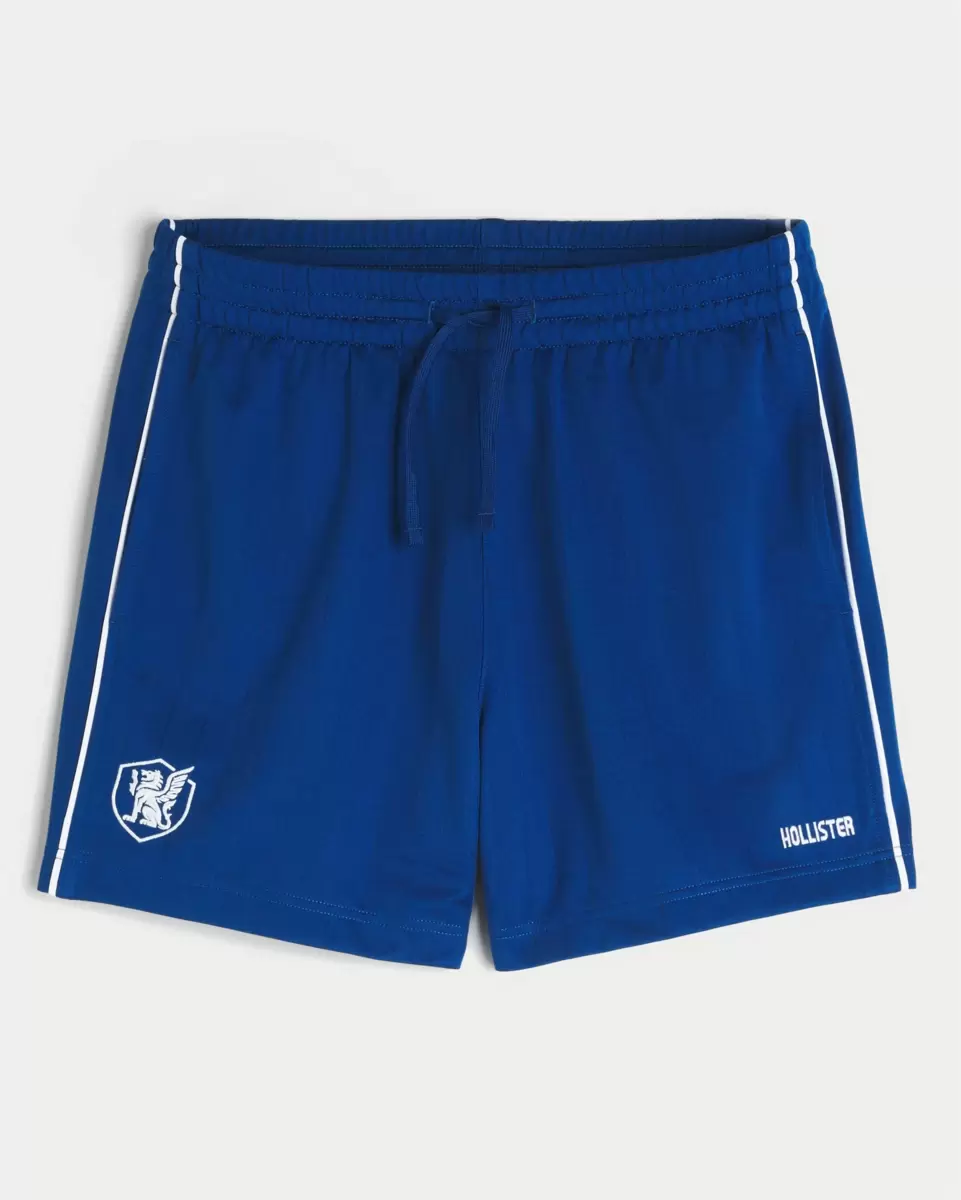 Super soft knit soccer shorts with a drawstring waist and embroidered logo detail at the left hem. Pockets, mid-thigh length, embroidered icon at right hem. Imported.