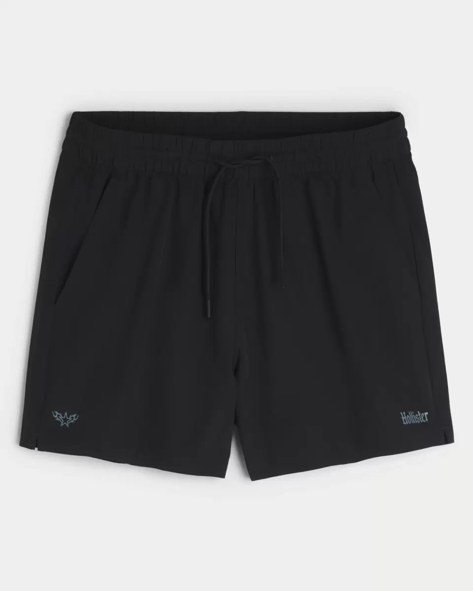 Comfortable active shorts with stretch, designed with a mid-thigh length and drawstring waist. Logo detail, pockets. Imported.