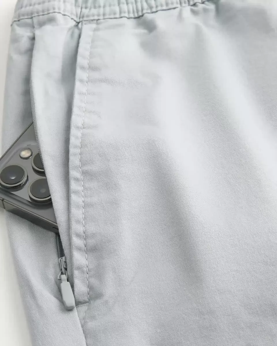 Ultra-comfortable shorts in twill fabric, designed with a pull-on drawstring waist and above-the-knee fit. Pockets, right zipper pocket. Imported.