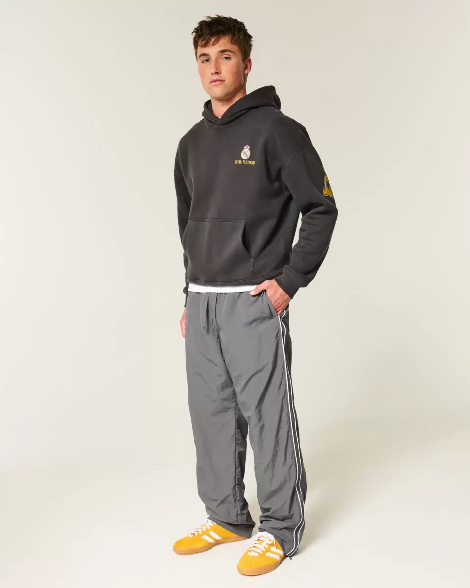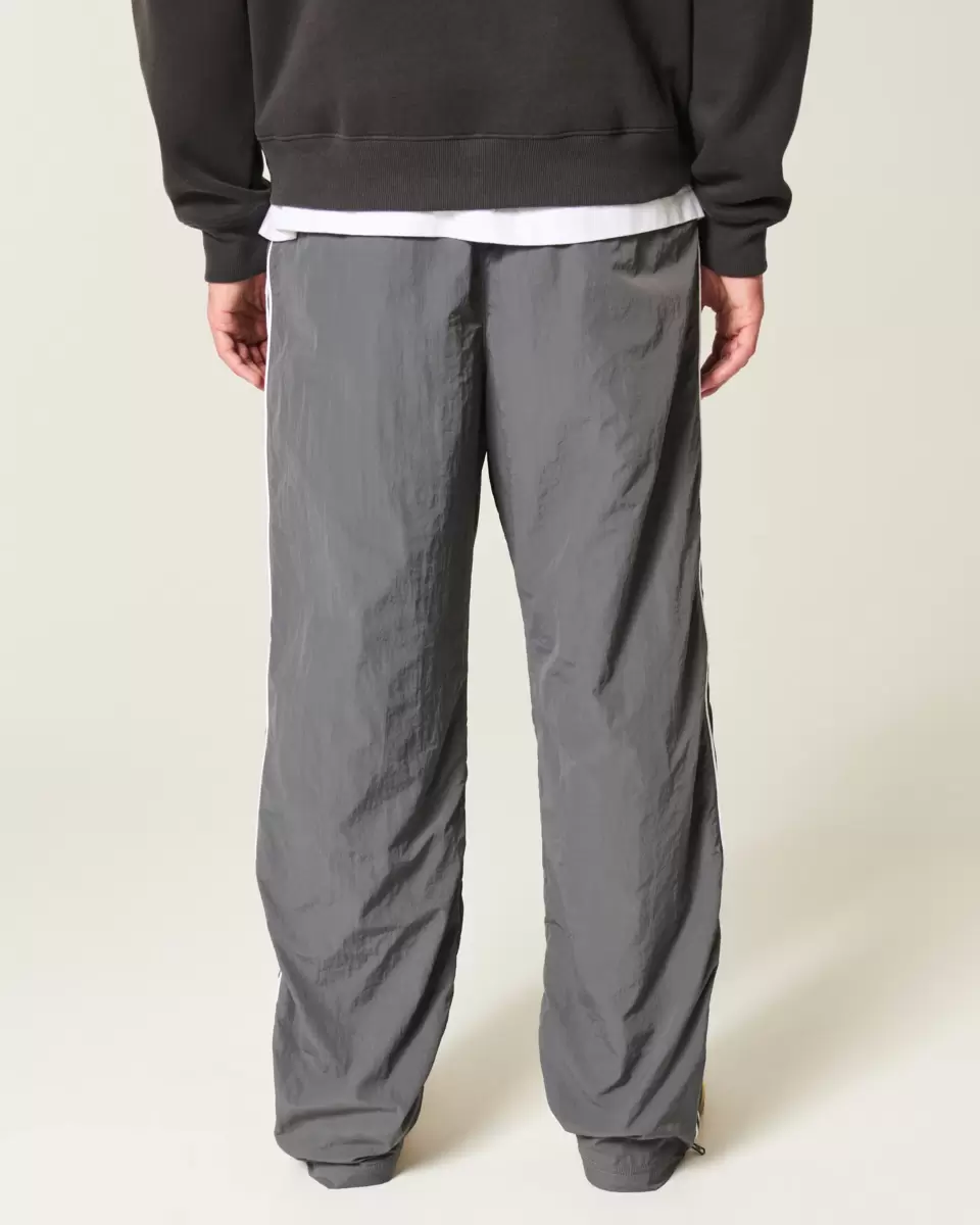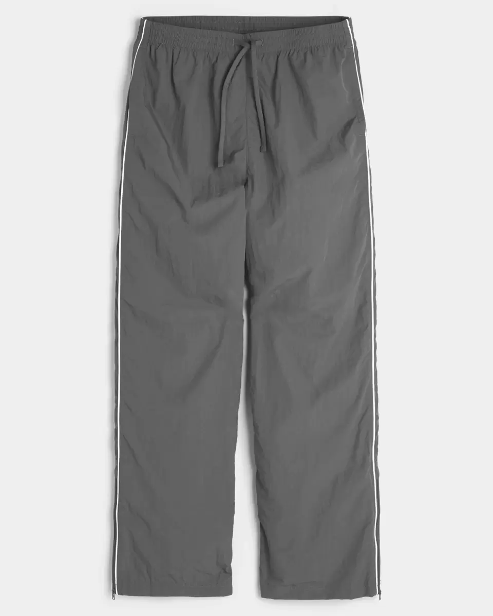 Super comfortable track pants with a drawstring waist and side piping. Pockets, bootcut leg when unzipped and baggy leg when zipped. Imported.