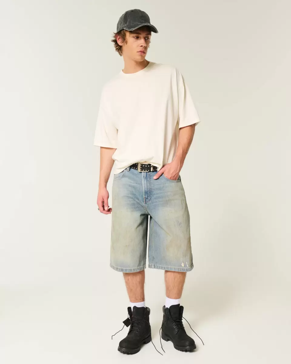 Comfortable denim shorts with greased and distressed details. Super baggy leg, fading, whiskering. Imported.