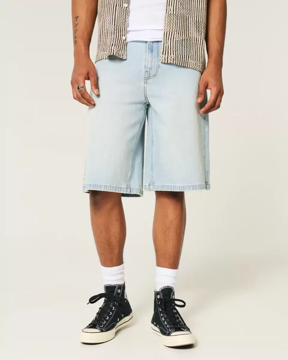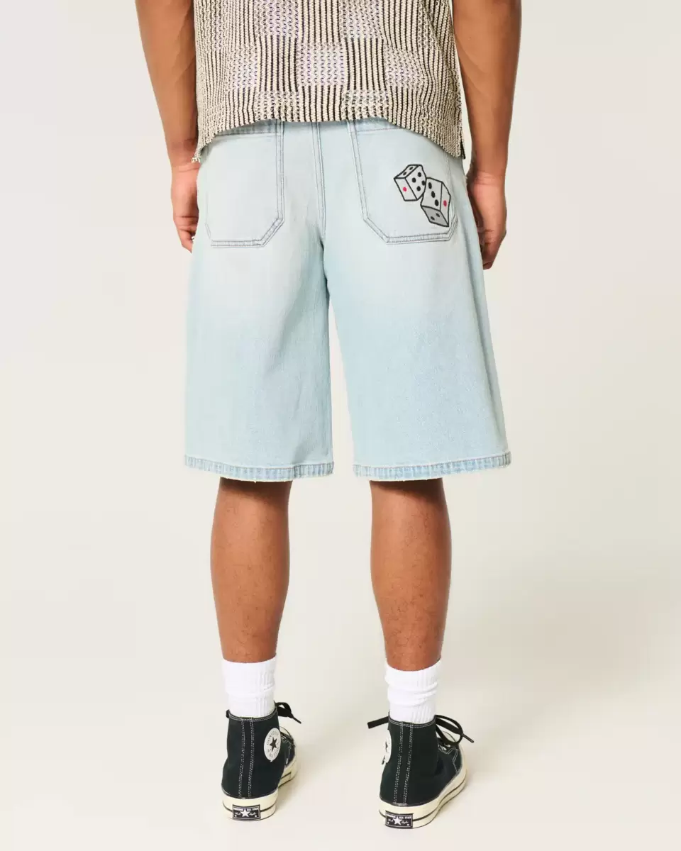 Comfortable denim shorts in a light wash, designed with a super baggy leg. Fading, dice graphic embroidery at back pocket. Imported.