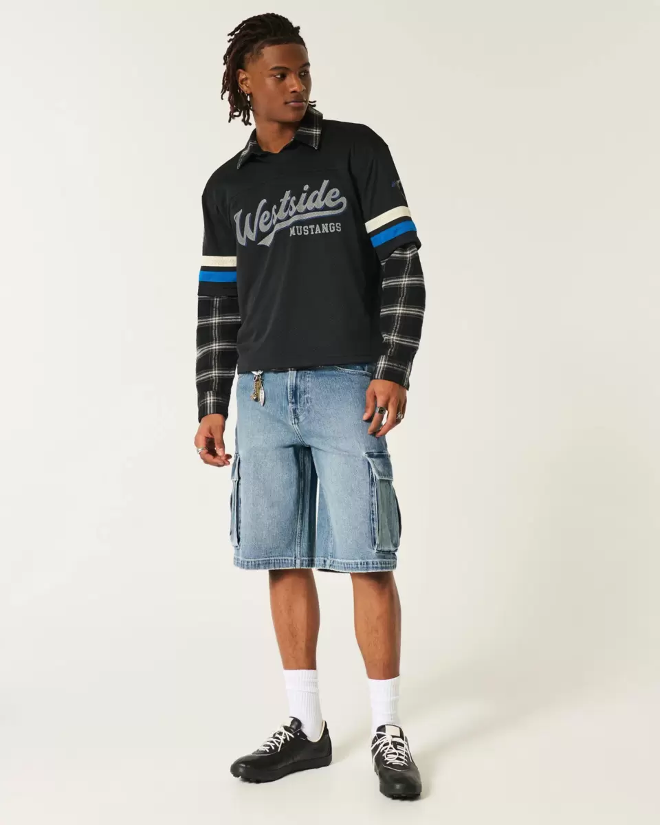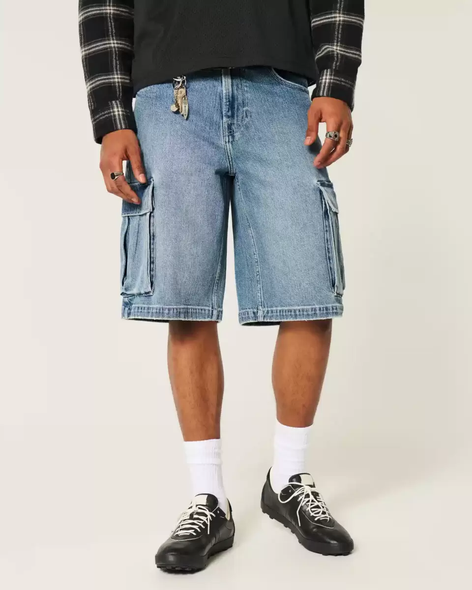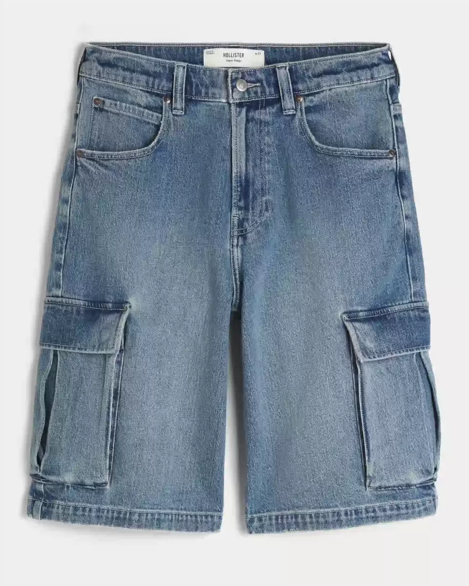 Comfortable denim shorts in a medium wash, designed with a super baggy leg and side cargo pockets. Fading, stretch. Imported.