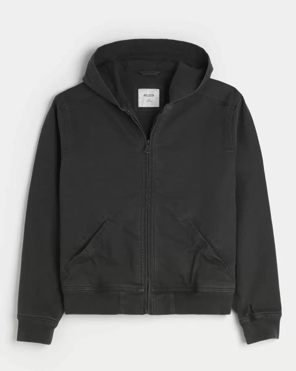 This super comfortable workwear-style jacket features a zip-up closure and hood. Pockets, banded trims. Imported.