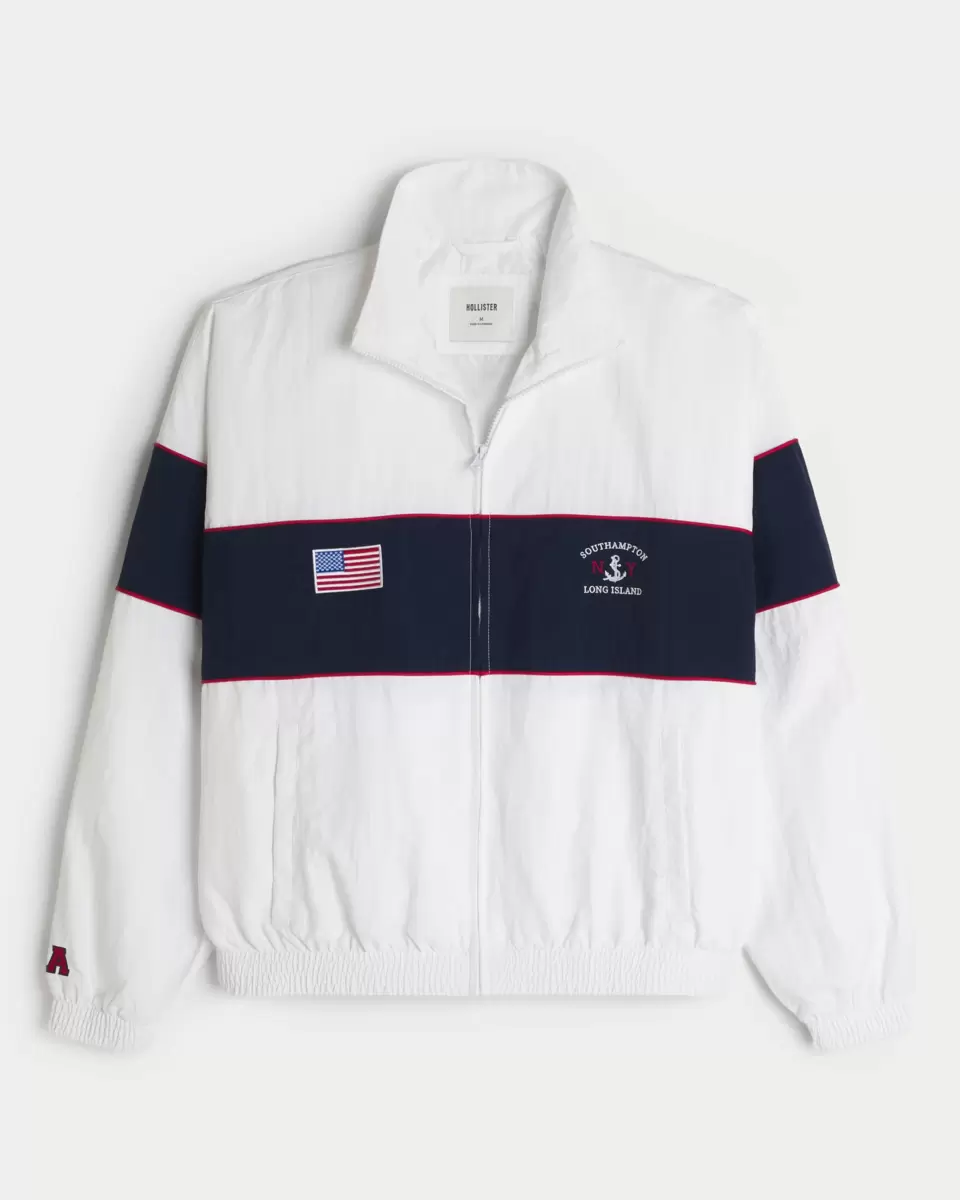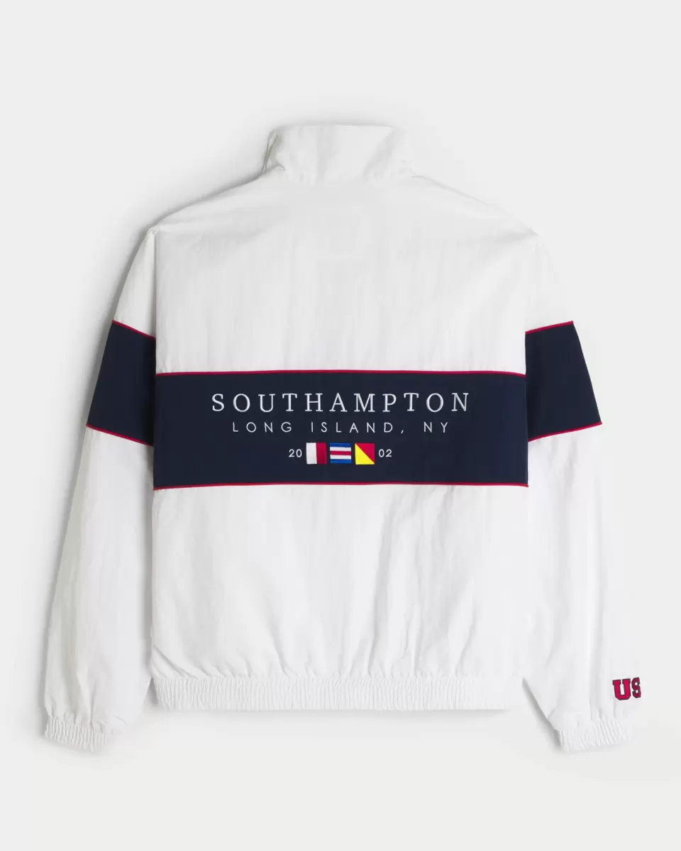 A classic jacket with Southampton Long Island NY graphic embroidery at the front and back. Embroidered American Flag graphic, pockets, banded hems, mock-neck collar, full zip-up closure. Imported.