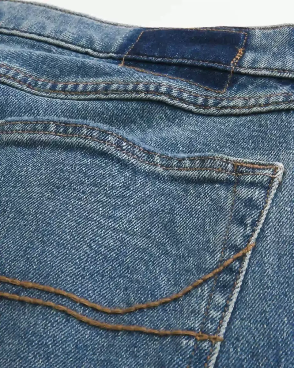 Comfortable denim jeans designed with a relaxed leg and boot opening. Medium wash with fading and whiskering. Button fly. Trend drop.