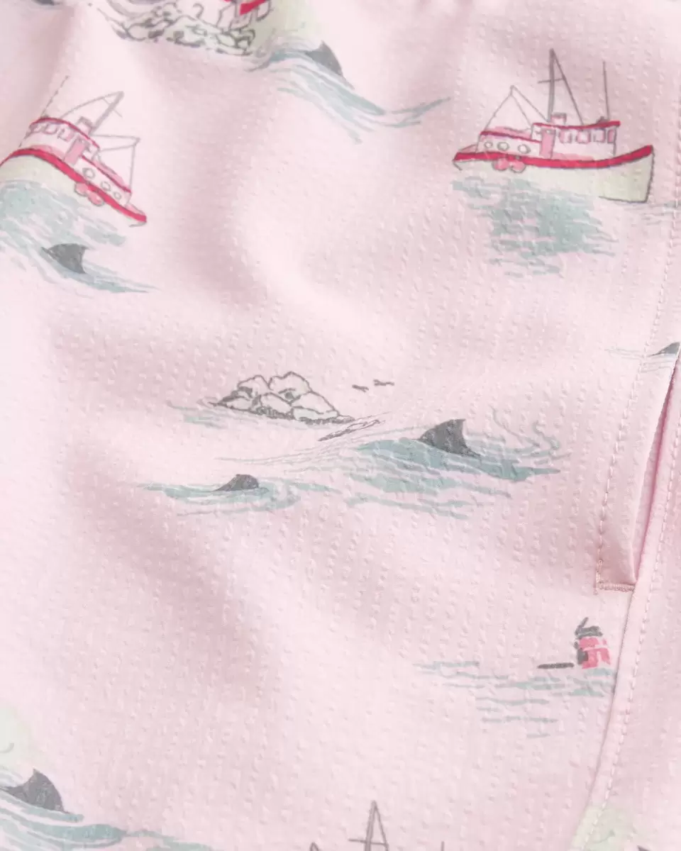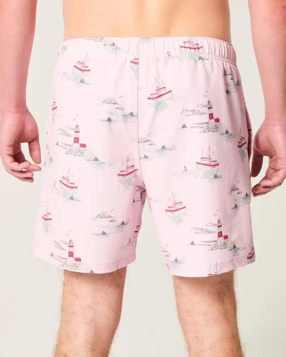 Shorter-length swim trunks that hit mid-thigh. Featuring comfortable 4-way stretch seersucker swim fabric and a 6″ inseam. Front pockets, mesh lining. Imported.