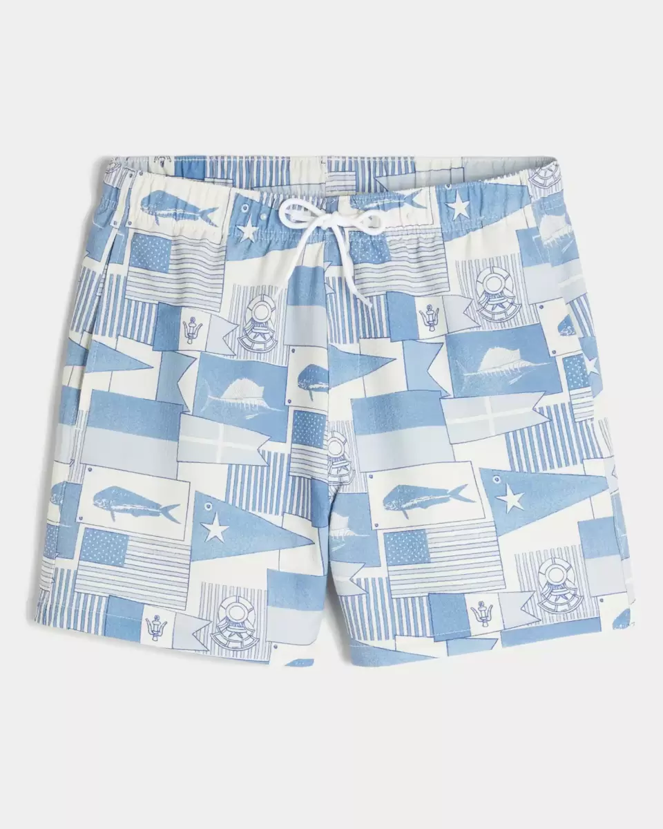 Shorter-length swim trunks that hit mid-thigh. Featuring comfortable 4-way stretch seersucker swim fabric and a 6″ inseam. Front pockets, mesh lining. Imported. Imported.