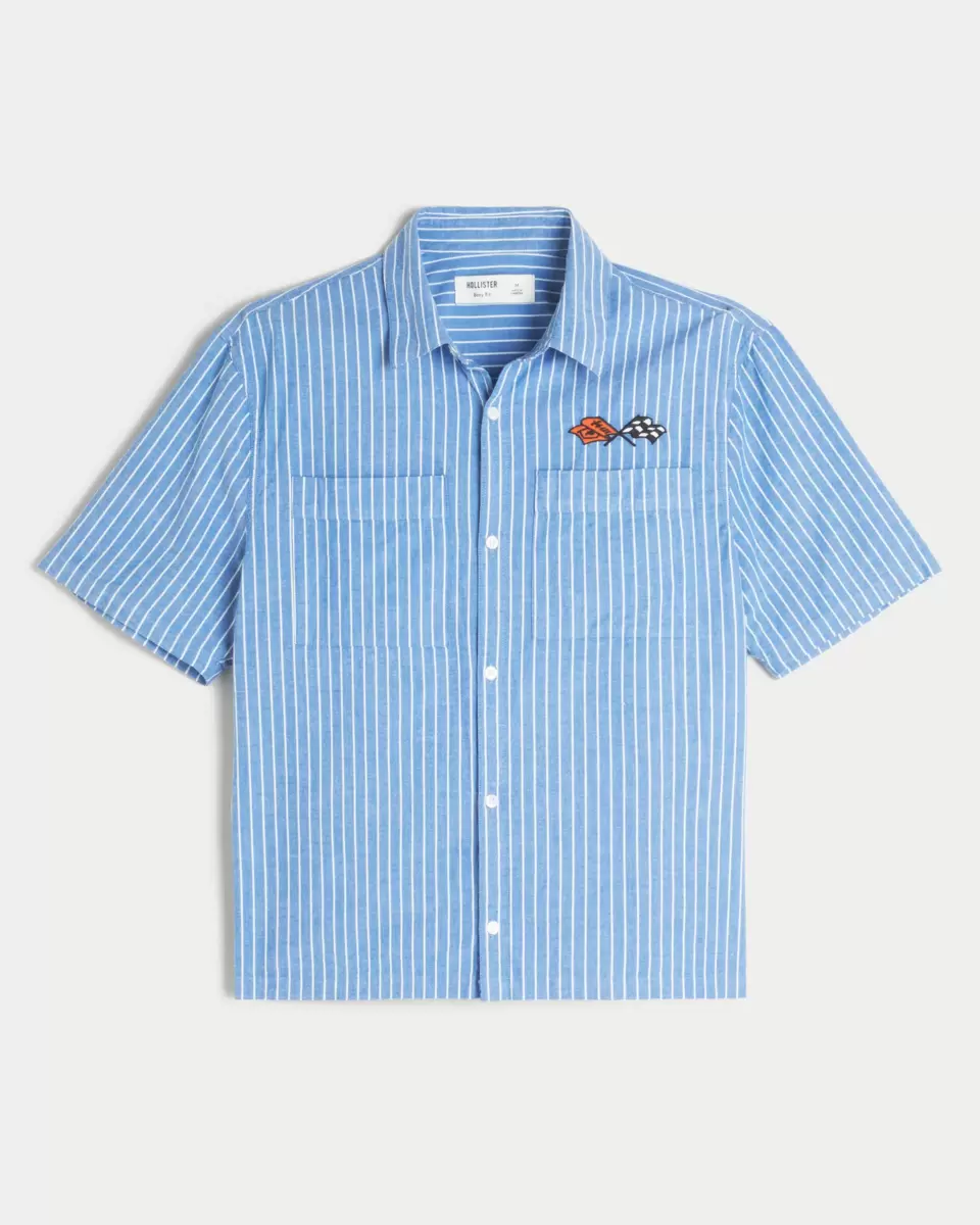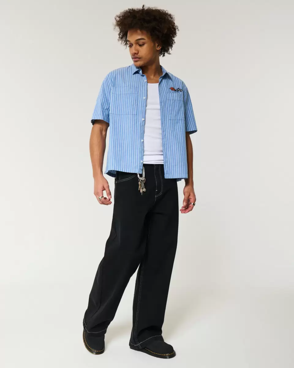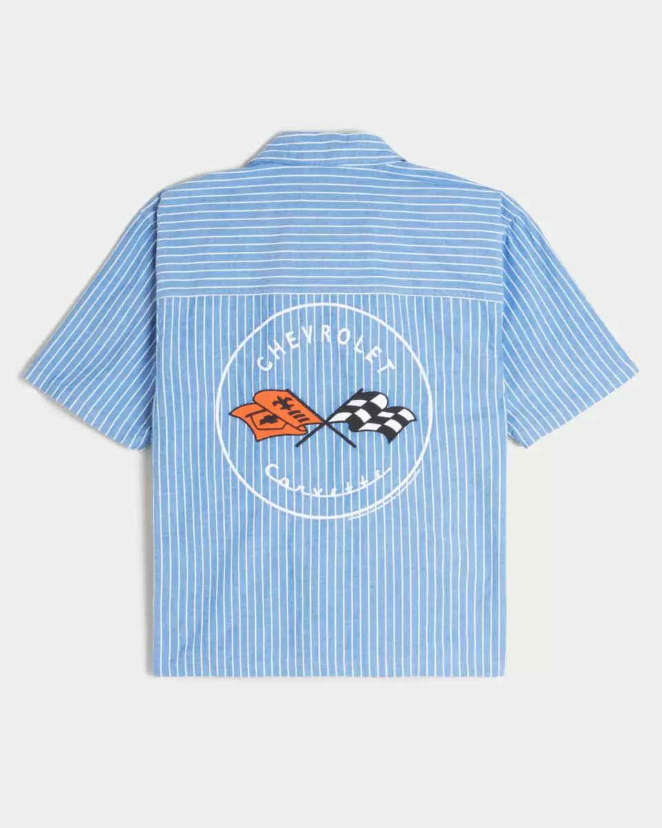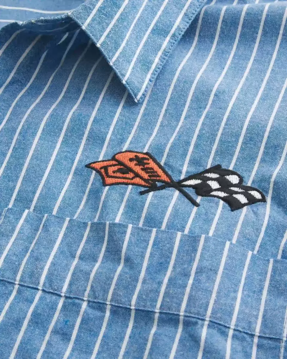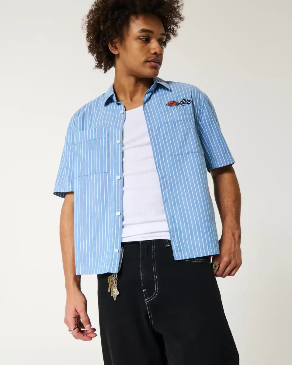 A classic workwear-style shirt with short sleeves and a full button closure. Official licensed Chevrolet Corvette graphic embroidery at the left chest and back, collar, short sleeves, chest pockets. Boxy Fit. Imported.