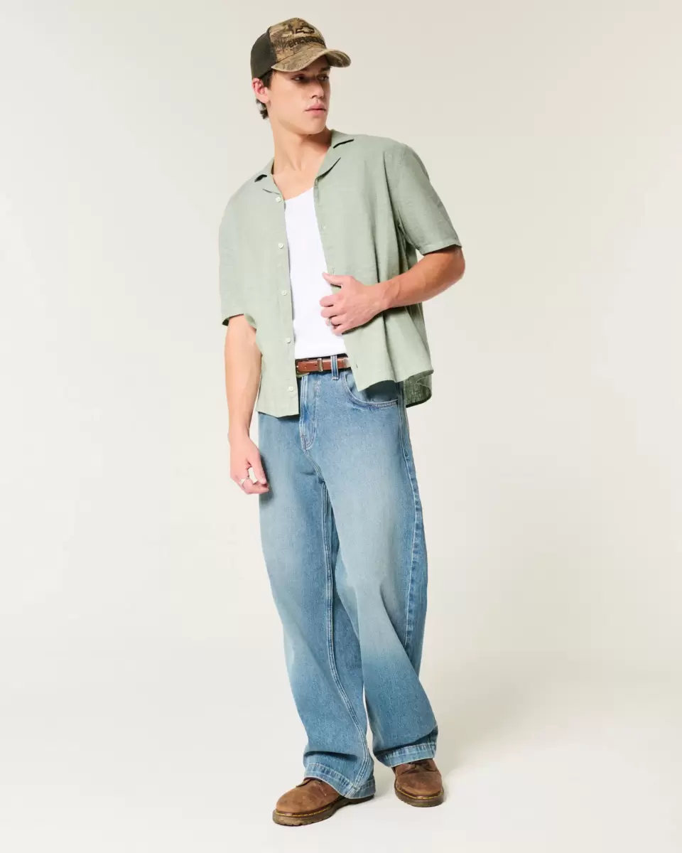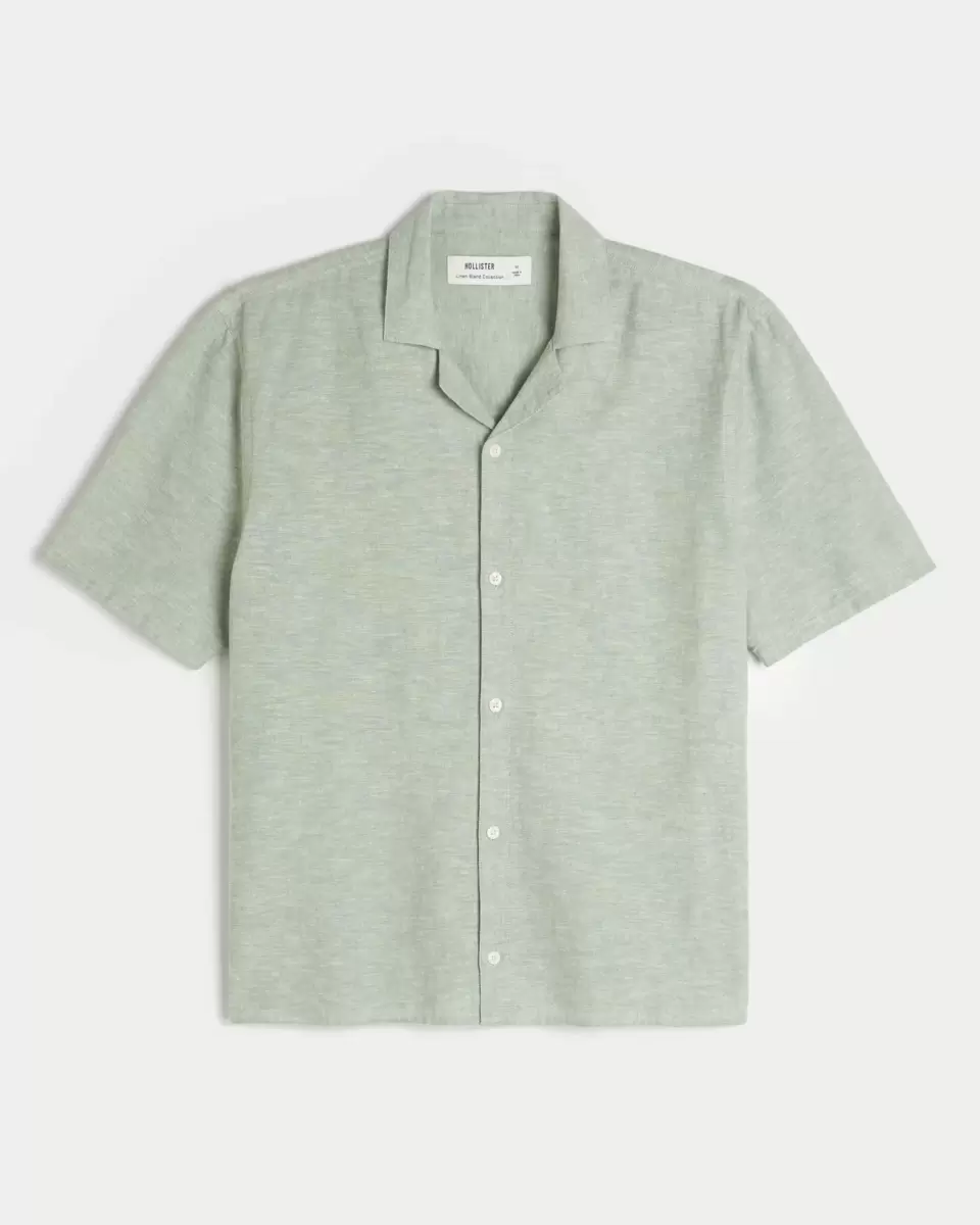 This classic button-through shirt is made with a soft linen blend. Collar, short sleeves. Imported.