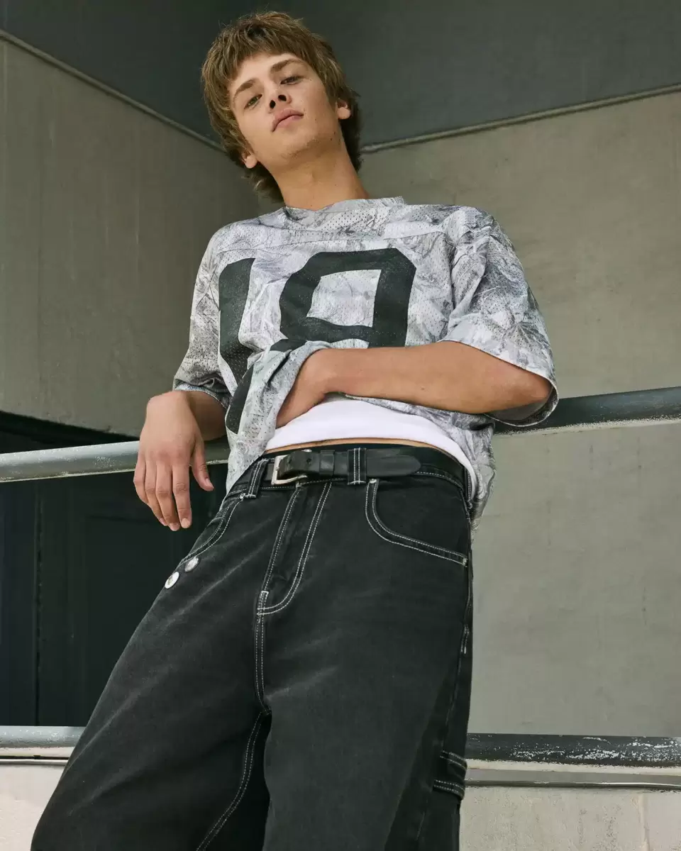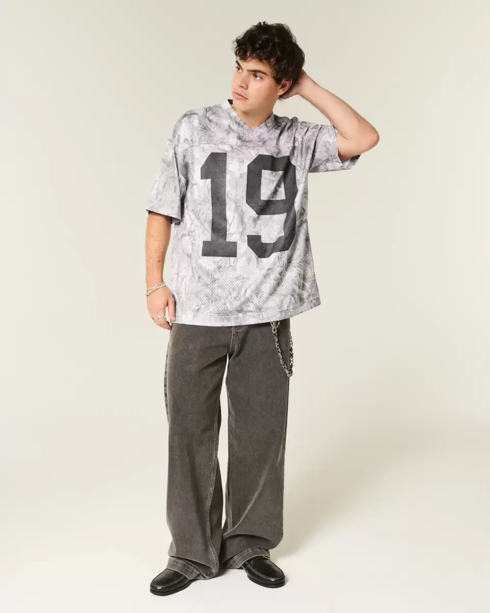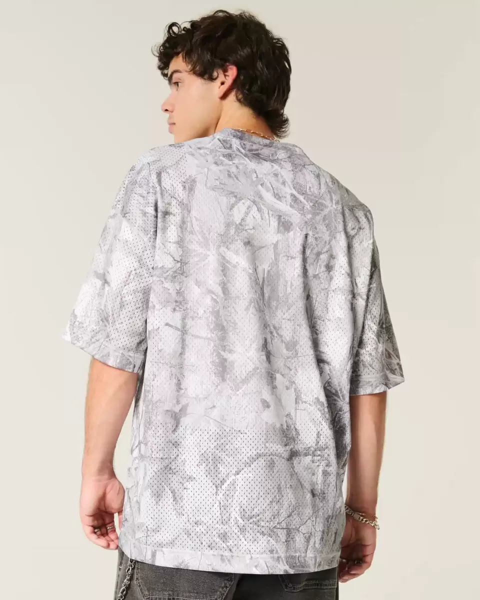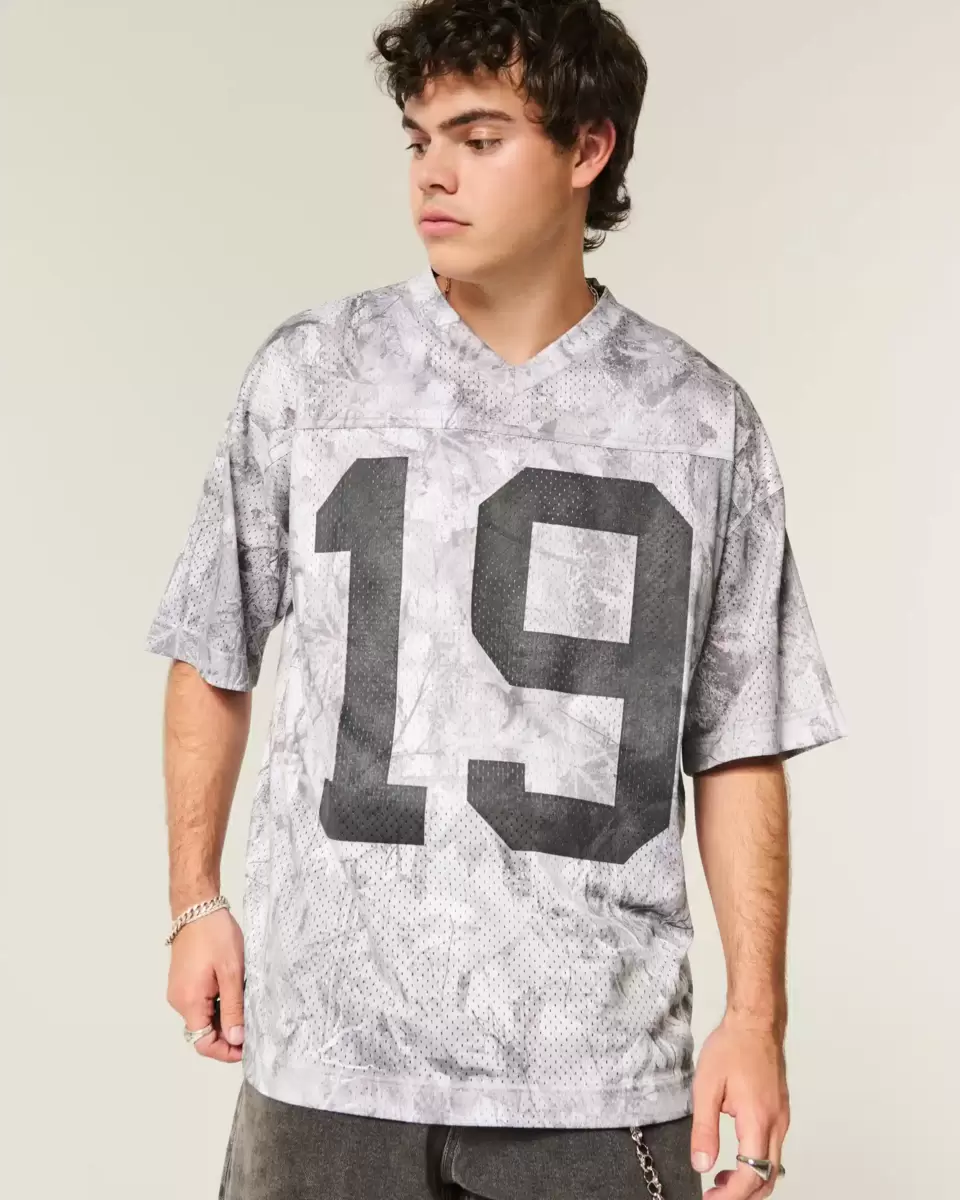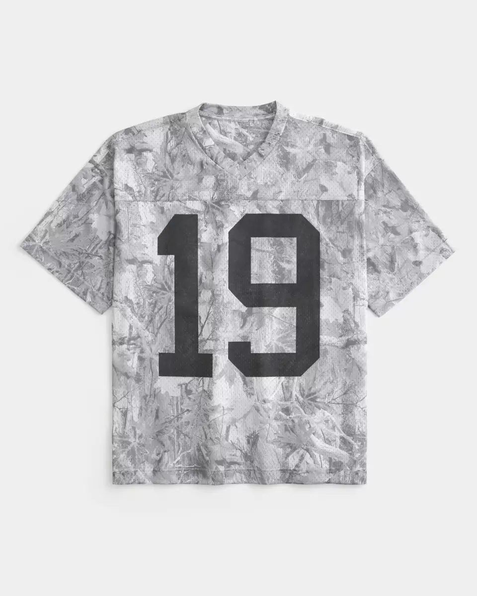 This classic football jersey features an all-over camo pattern and number print graphic. V-neckline, short sleeves, soft mesh fabric. Baggy Fit. Imported.