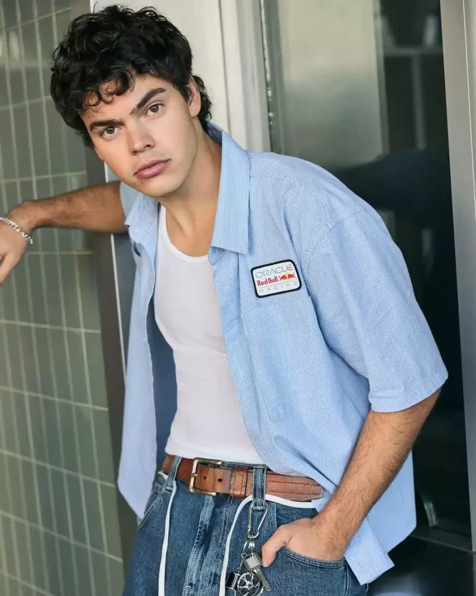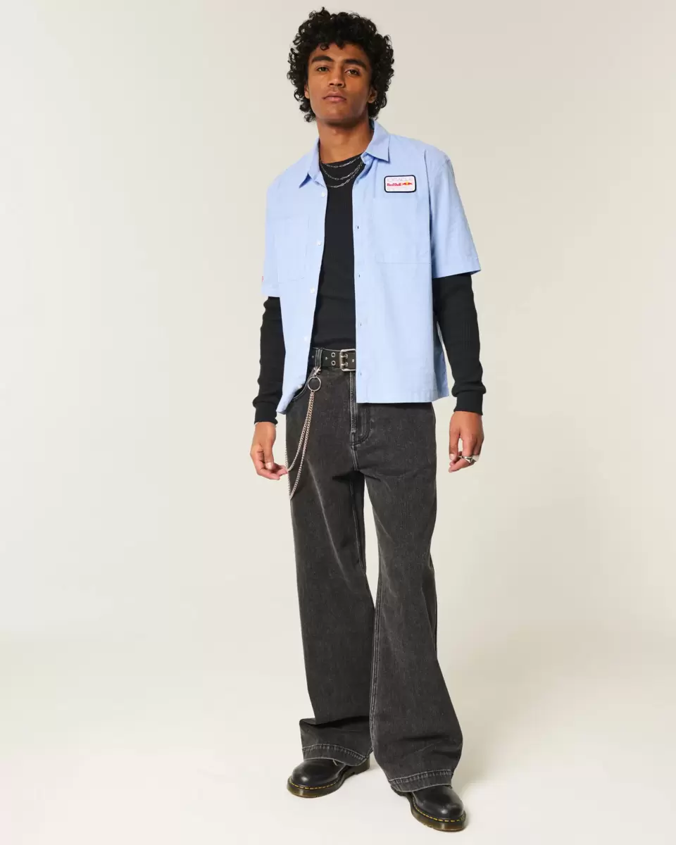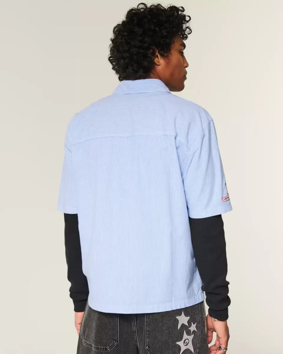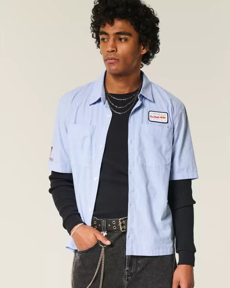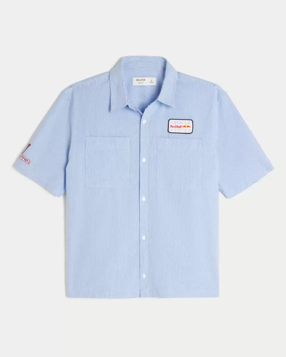 A classic workwear-style shirt with short sleeves and official licensed Oracle Red Bull Racing and Max Verstappen graphic embroidery at the left chest and right sleeve. Full button closure, chest pockets, collar. Boxy Fit. Imported.
