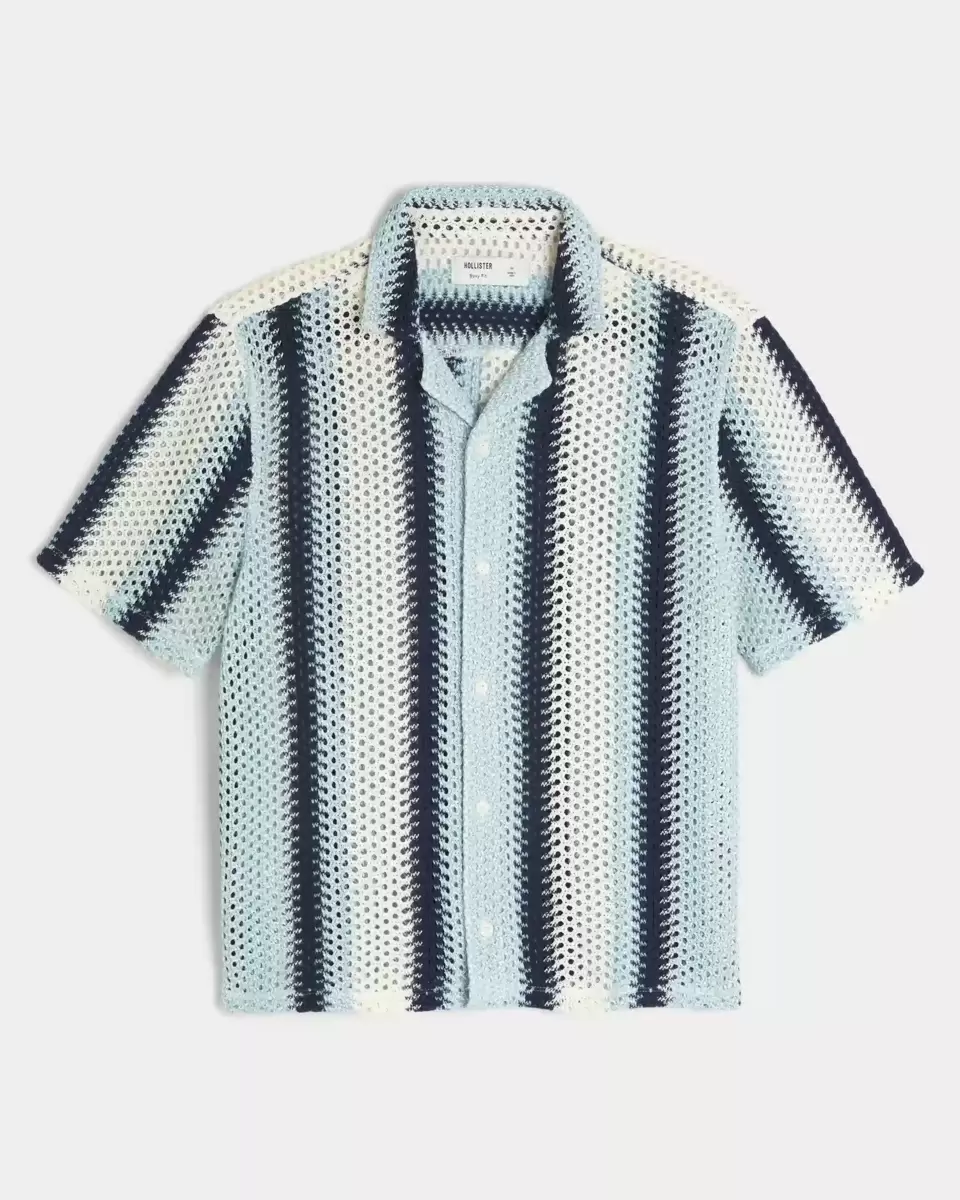 A short-sleeve shirt in soft crochet-style fabric with a camp collar. Boxy Fit.