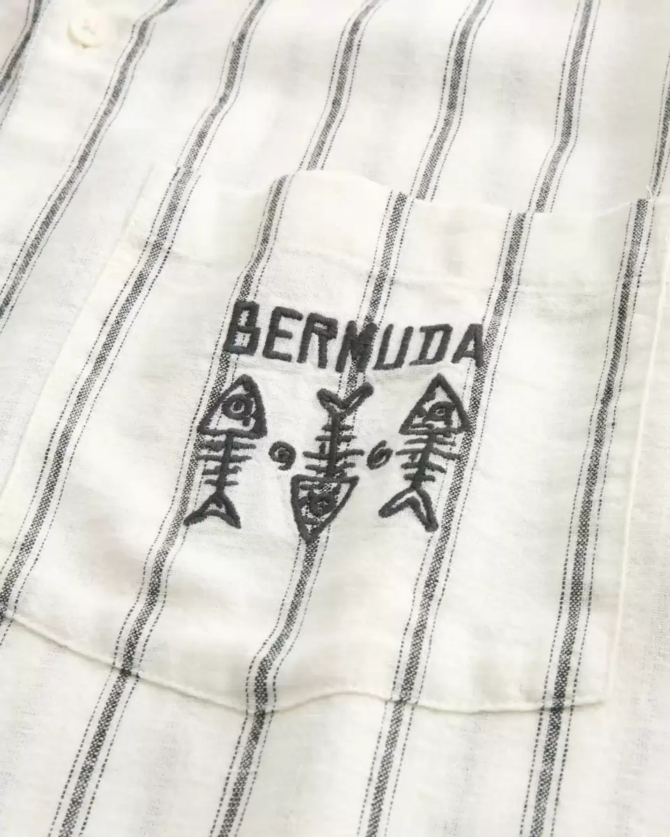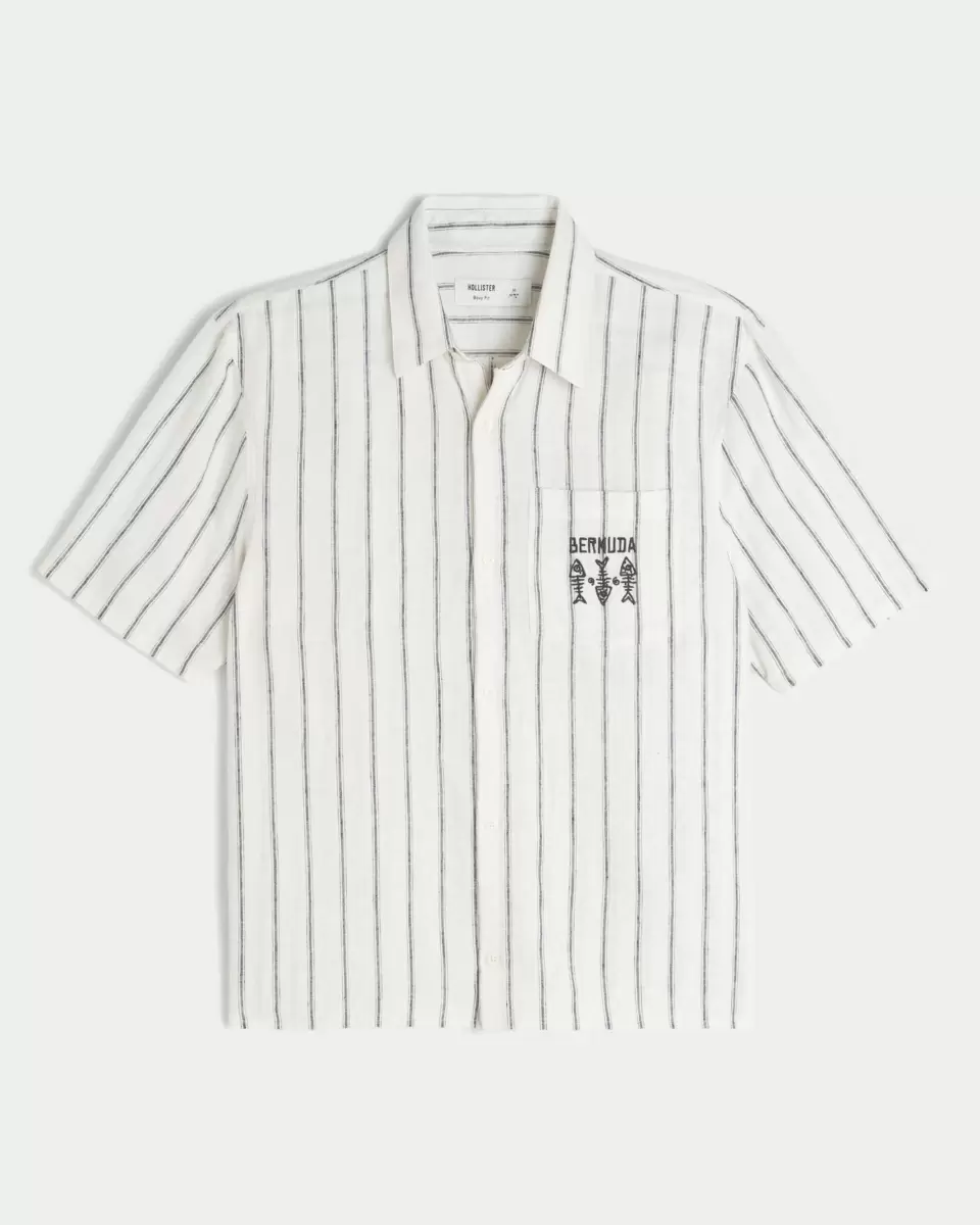 This classic shirt is made with a soft linen blend and features Bermuda graphic embroidery at the left chest pocket. Camp collar, short sleeves, full button closure. Boxy Fit.