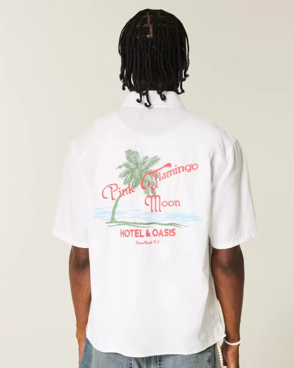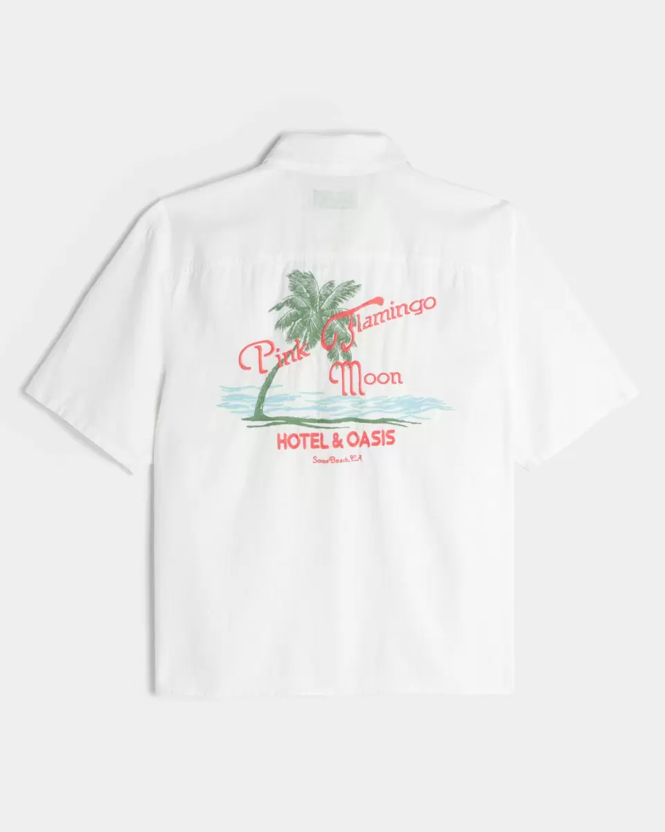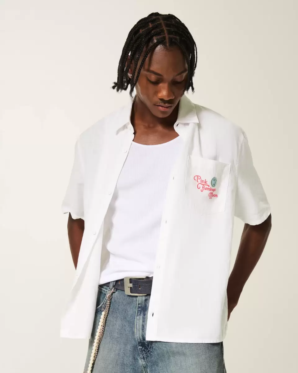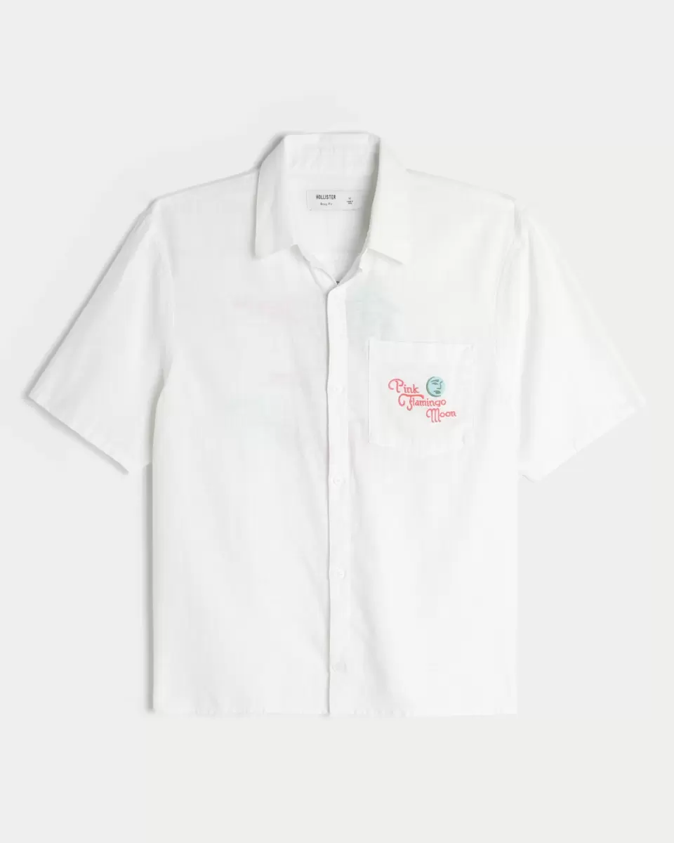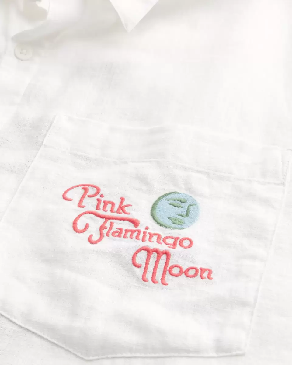 This classic shirt is made with a soft linen blend and features Pink Flamingo Moon graphic embroidery at the left chest pocket and back. Camp collar, short sleeves, full button closure. Boxy Fit. Imported.