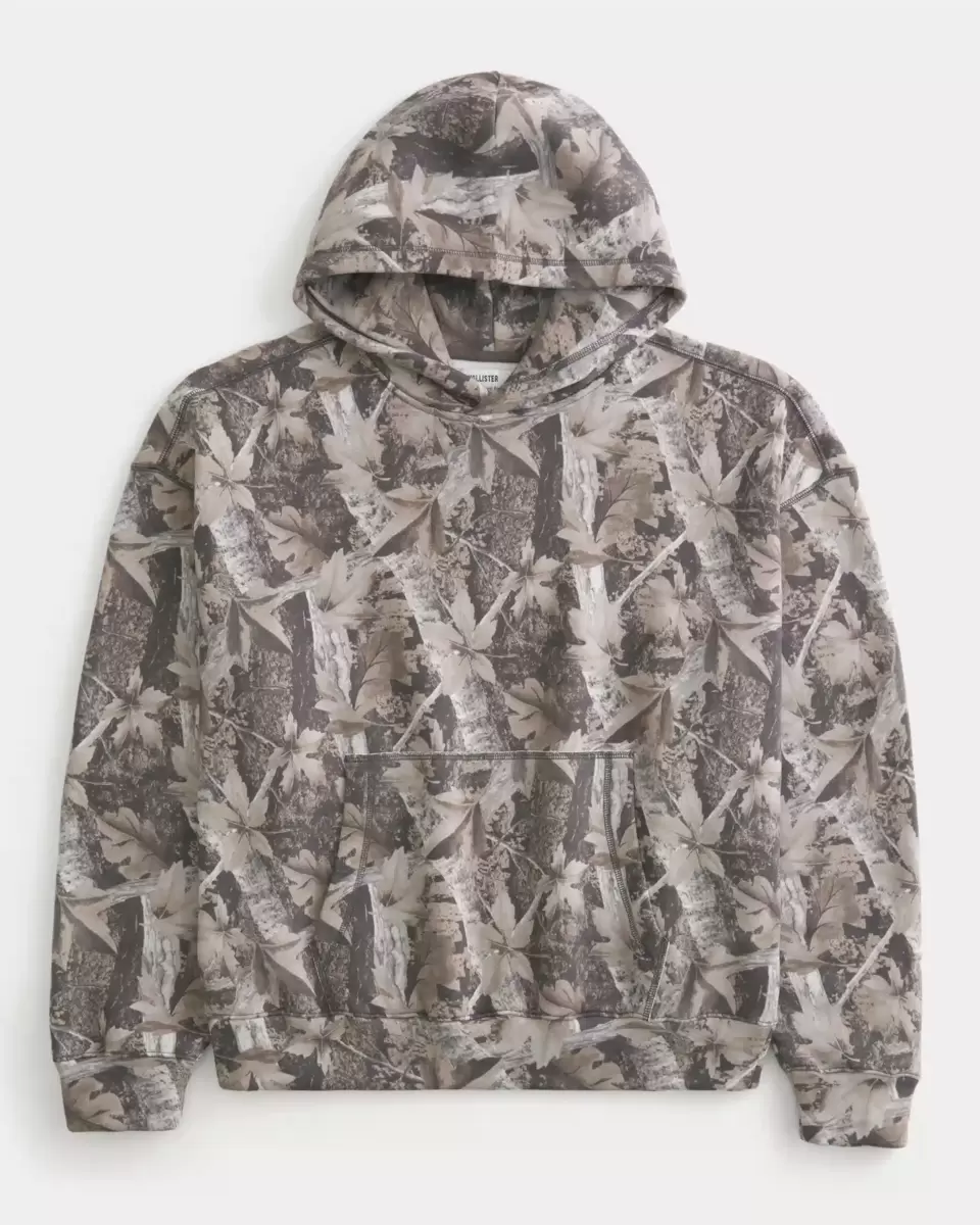 A super soft fleece hoodie featuring an all-over camo pattern. Front pouch pocket, hood, long sleeves. Baggy Cinch Fit. Imported.