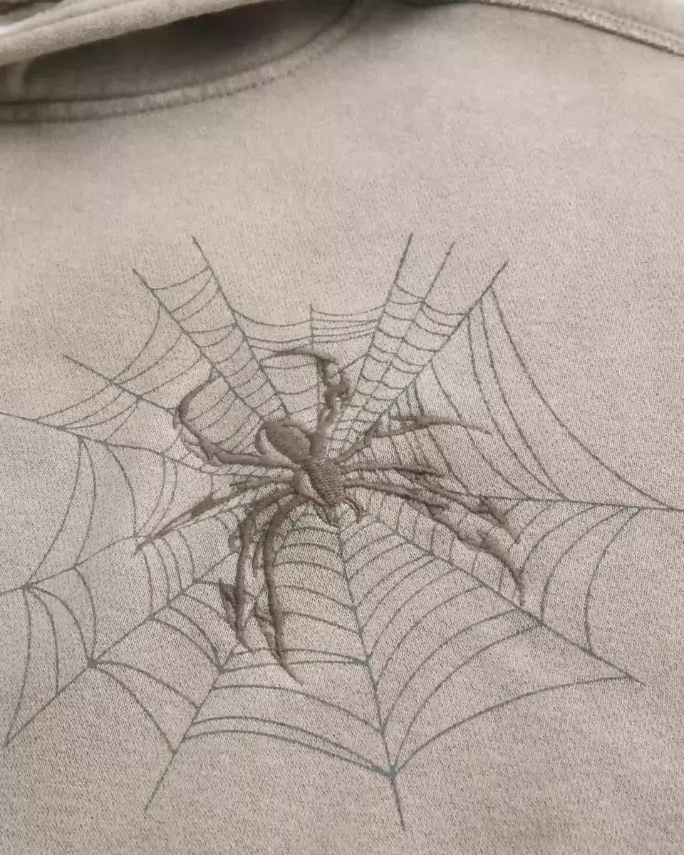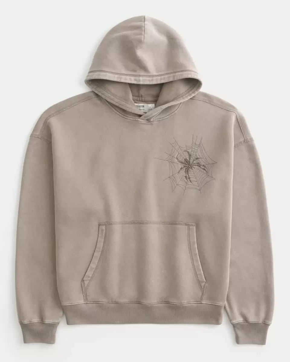 This super soft fleece hoodie features spider graphic embroidery at the left chest. Hood, front pouch pocket, long sleeves. Baggy Cinch Fit. Imported.
