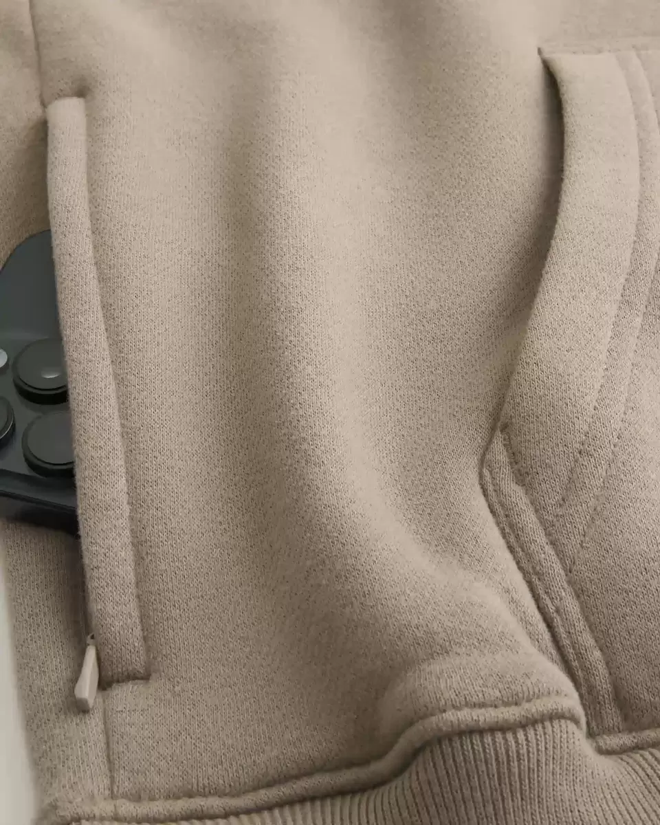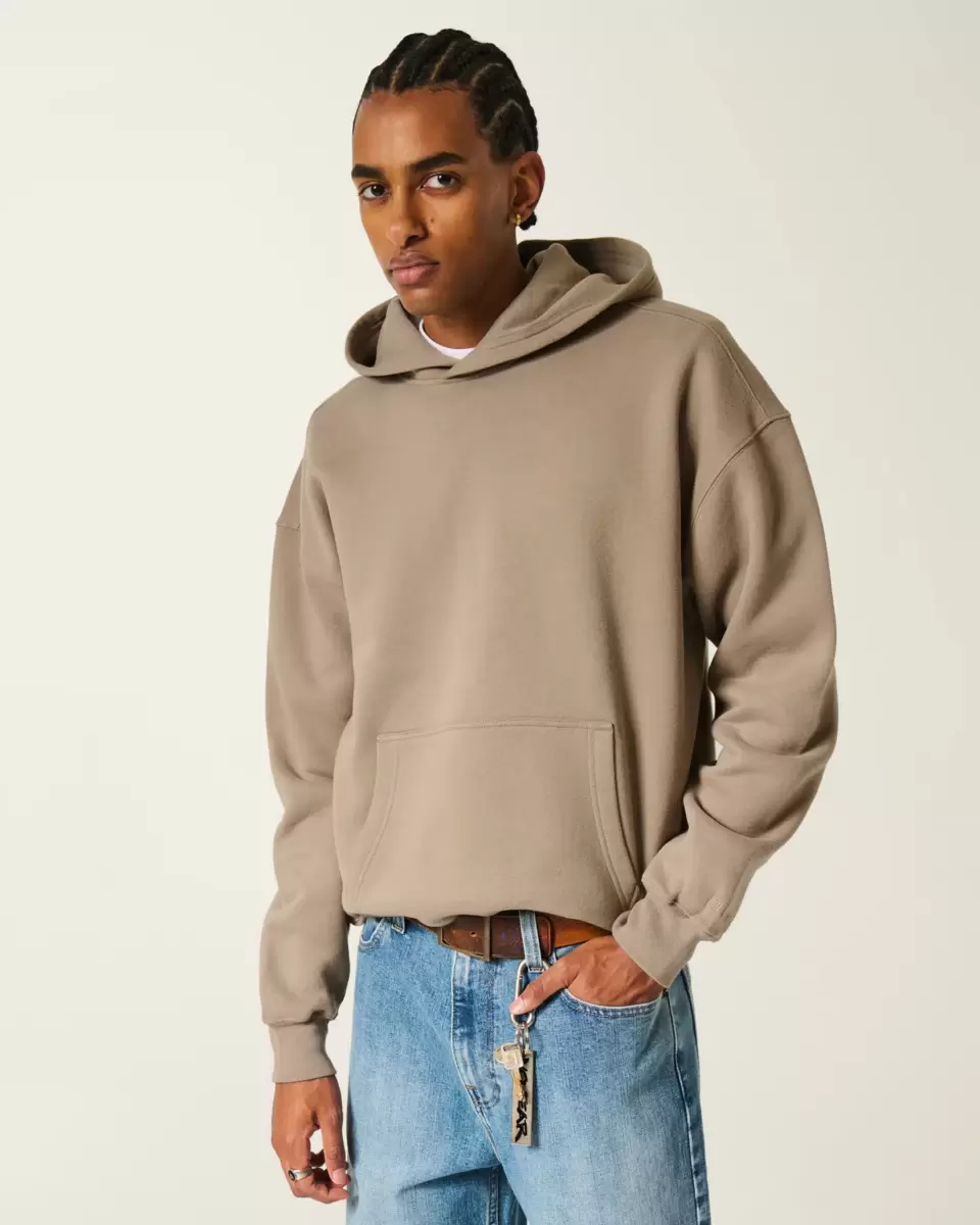 A super soft and comfortable fleece hoodie with a front pouch pocket and long sleeves. Embroidered logo detail at left sleeve, hood. Boxy Fit. Imported.