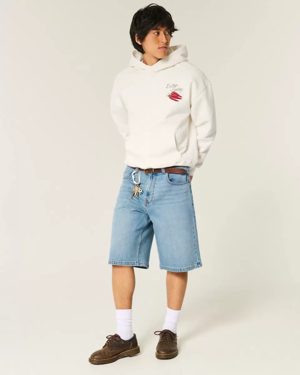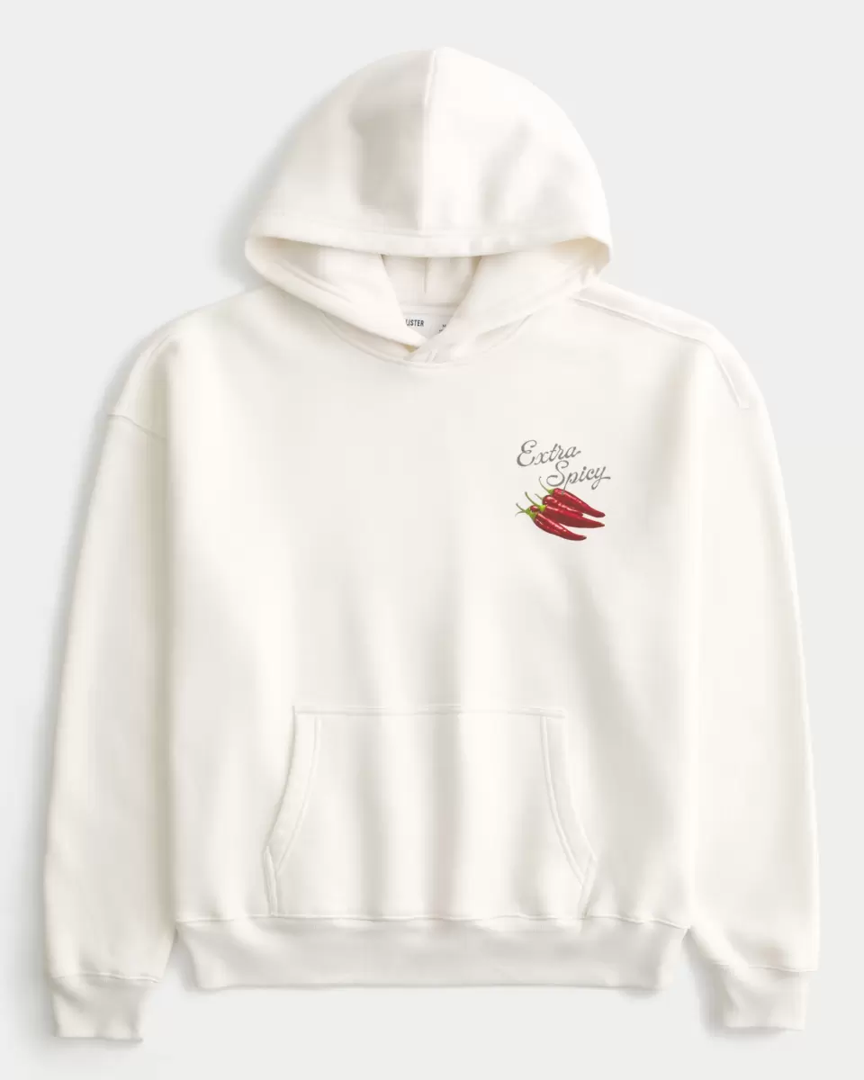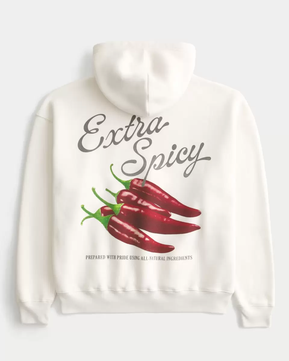 A super soft fleece hoodie featuring Extra Spicy peppers print graphics at the left chest and back. Hood, front pouch pocket, long sleeves. Imported.