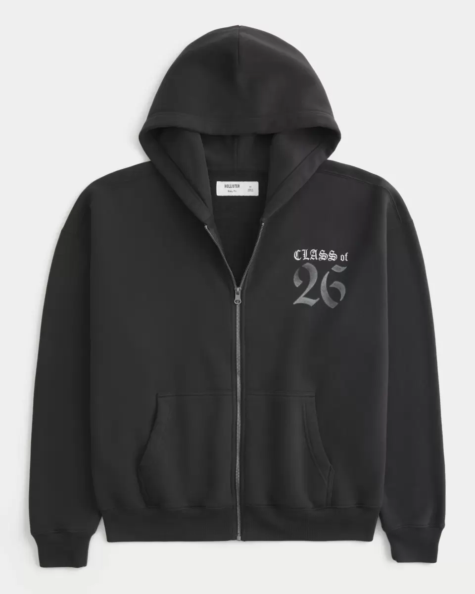 A super soft fleece hoodie featuring Class of 26 print graphics at the left chest and a bold 26 print graphic at the back. Full zip-up closure, front pockets, long sleeves, hood. Boxy Fit. Imported.