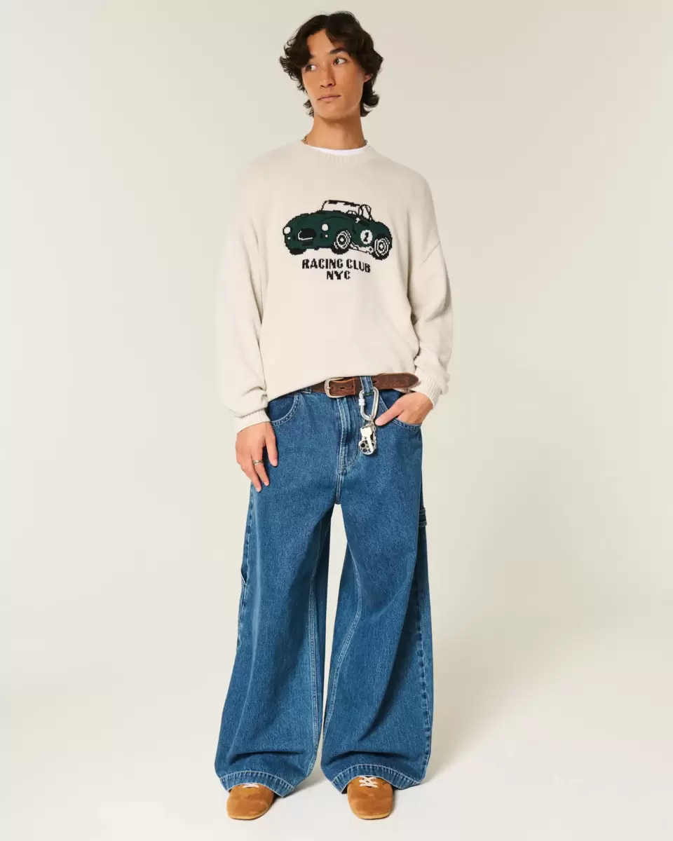 A super soft and comfortable sweater with a Racing Club NYC intarsia graphic. Crew neckline, long sleeves, ribbed trims. Boxy Fit. Imported.