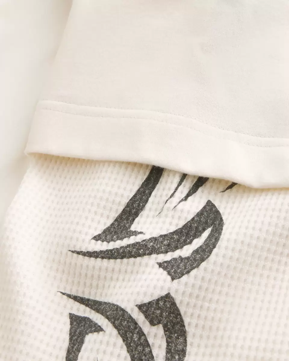 A super soft t-shirt featuring a Y2K-inspired California print graphic at the left chest and long thermal-fabric sleeves for a layered look. Crew neckline. Boxy Fit. Imported.