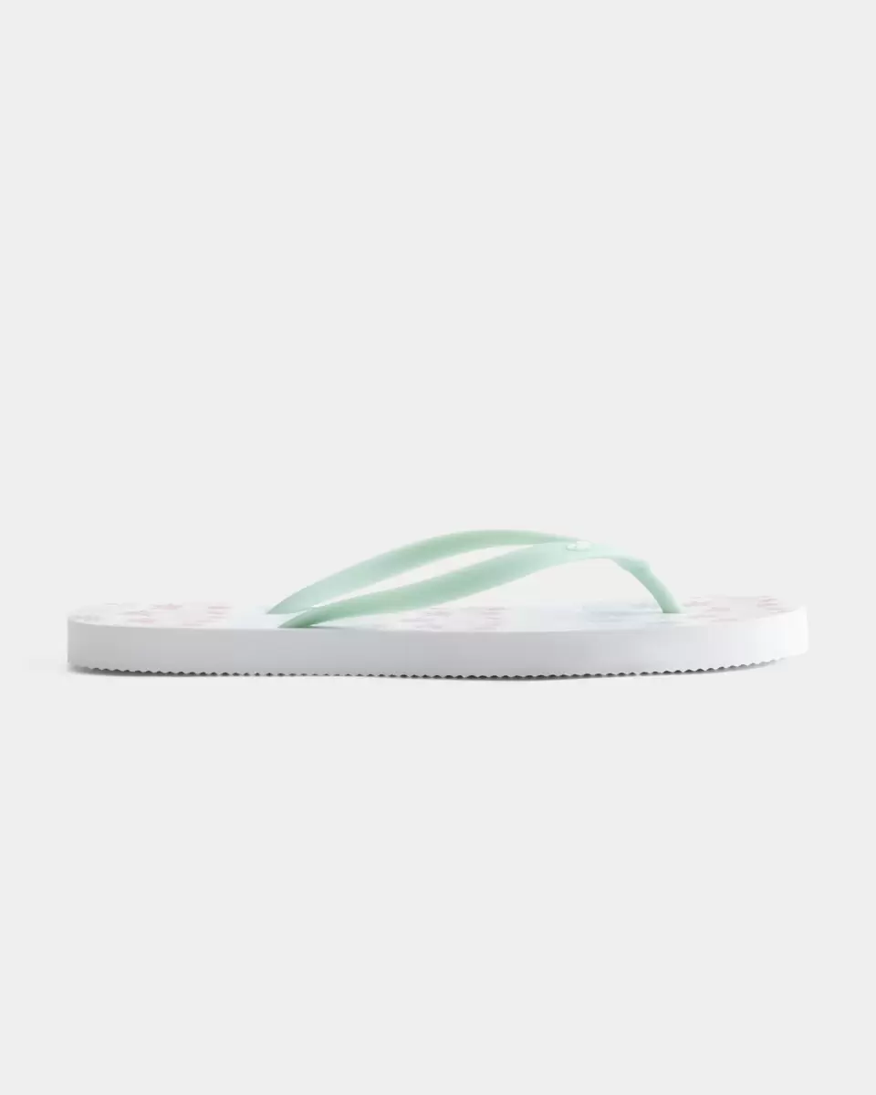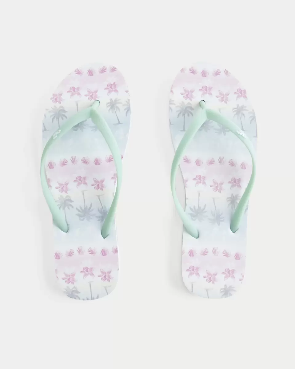 Cute flip flops with soft footbeds and rubber uppers. Logo details, beach graphics.