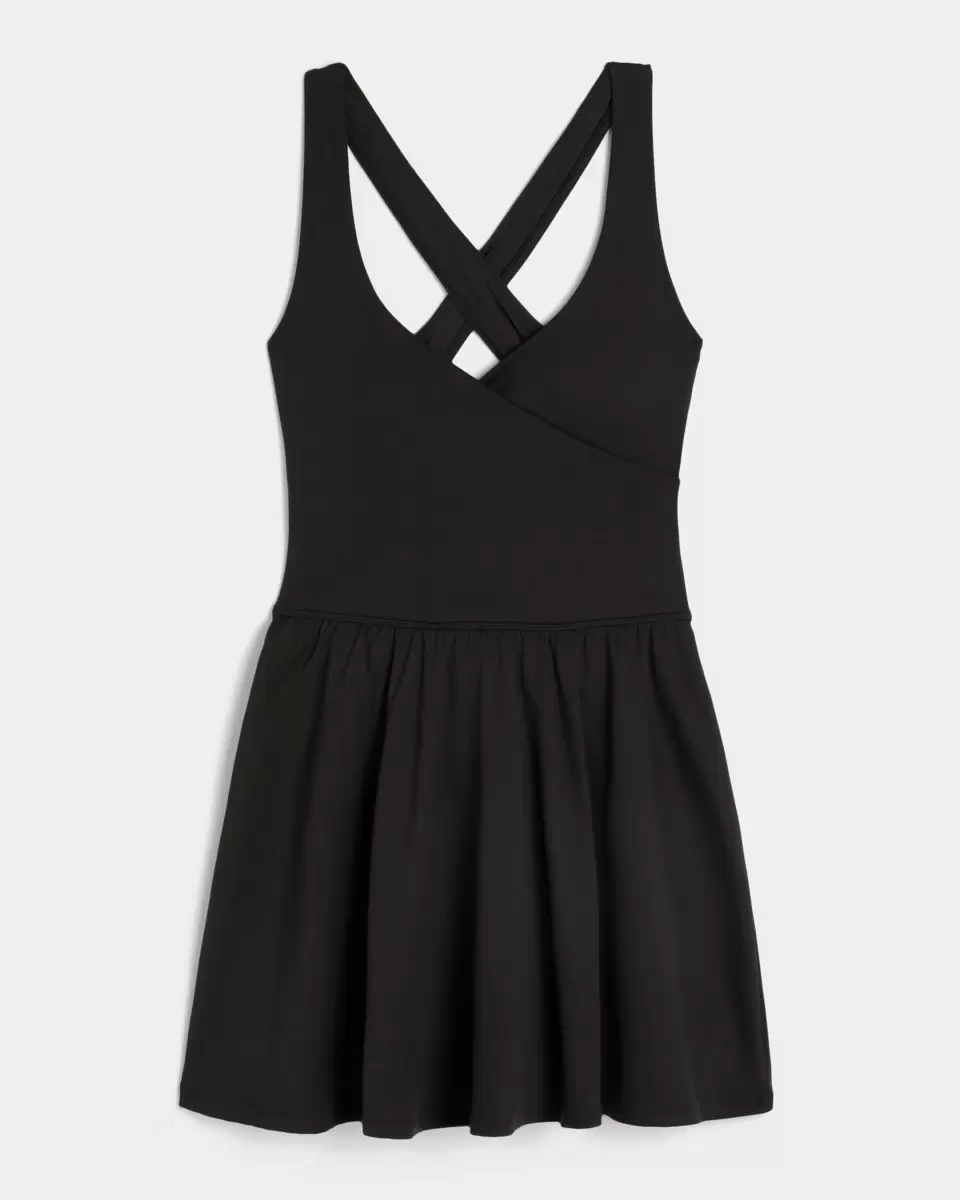 An ultra-comfortable active dress designed in our breathable, 4-way stretch, moisture-wicking Recharge fabric with a super soft, brushed feel. Built-in shorts and sports bra, wrap-style front and halter straps that cross in back. Imported.