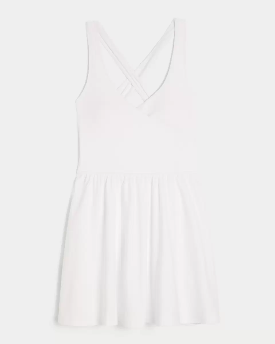 An ultra-comfortable active dress designed in our breathable, 4-way stretch, moisture-wicking Recharge fabric with a super soft, brushed feel. Built-in shorts and sports bra, wrap-style front and halter straps that cross in back. Imported.