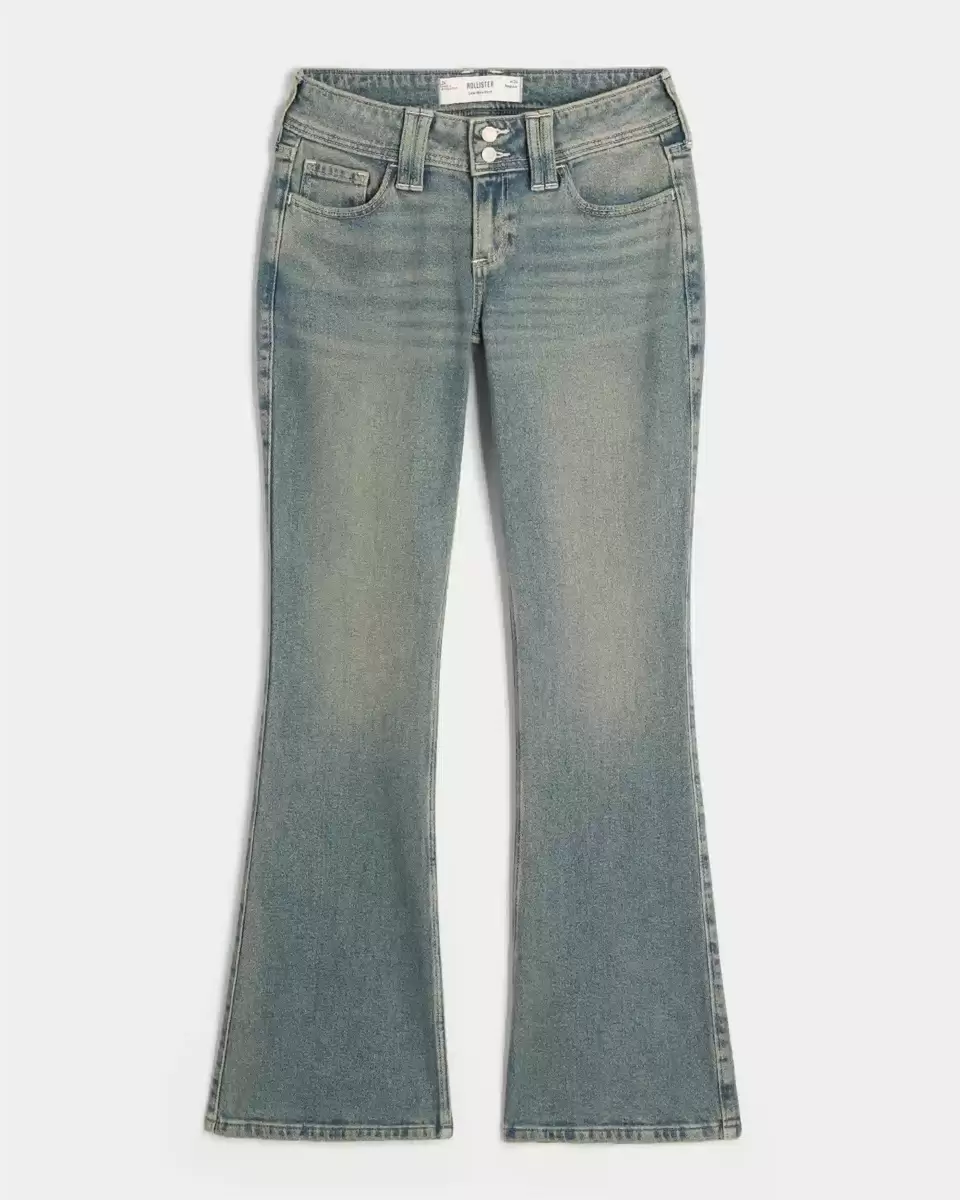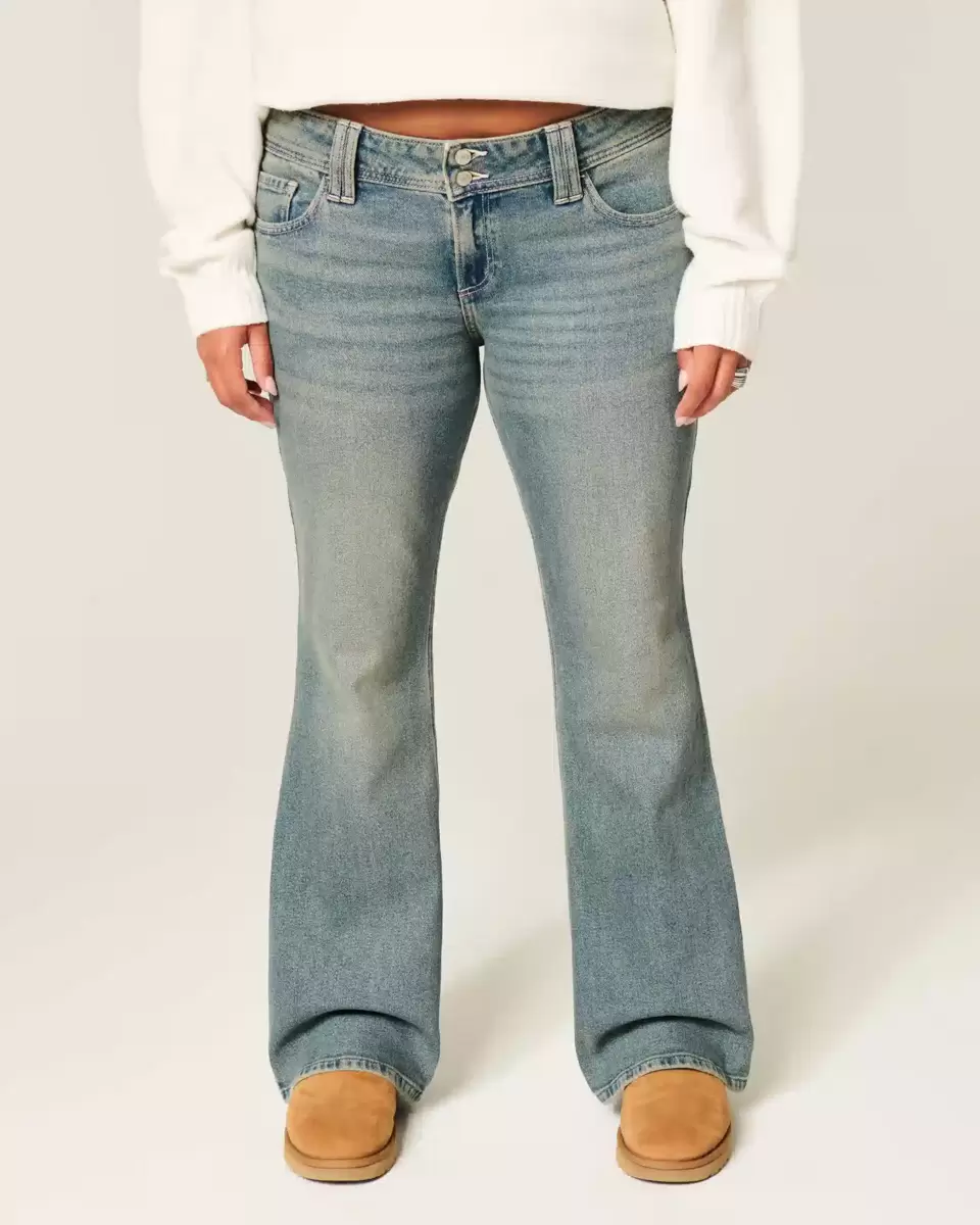 Comfortable denim jeans in a medium wash, designed with a flattering low-rise waist and bootcut hem. Fading, whiskering, Vintage Stretch denim, back flap pockets with butterfly emb