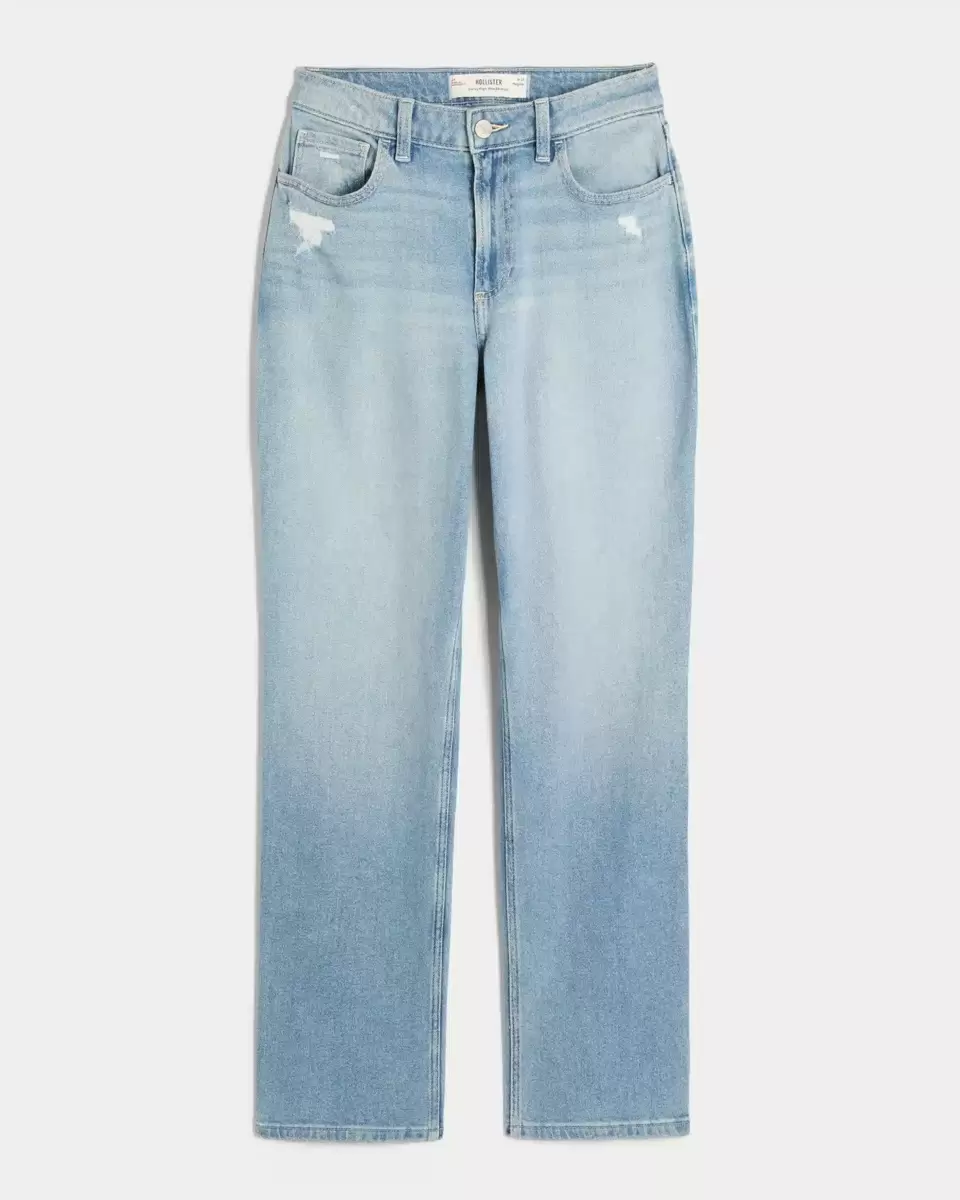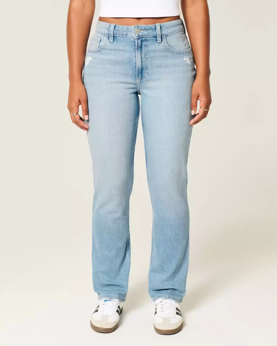 Comfortable denim jeans in a light wash, designed with flattering high-rise waist and straight leg. Vintage Stretch denim with fading, whiskering and distressed details. Imported.