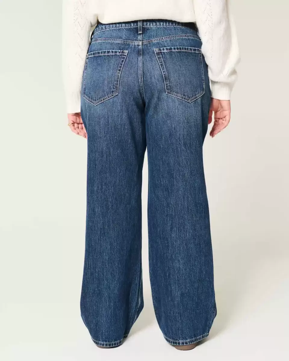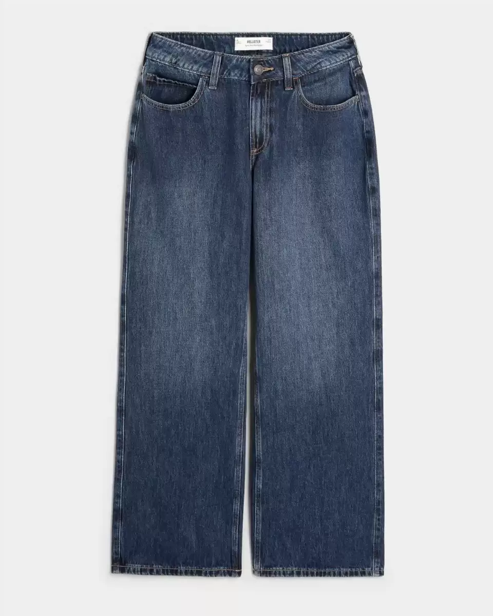 Designed with a mid-rise waist and baggy leg. Dark wash denim with fading. Imported.