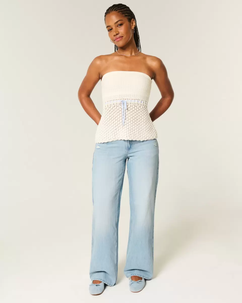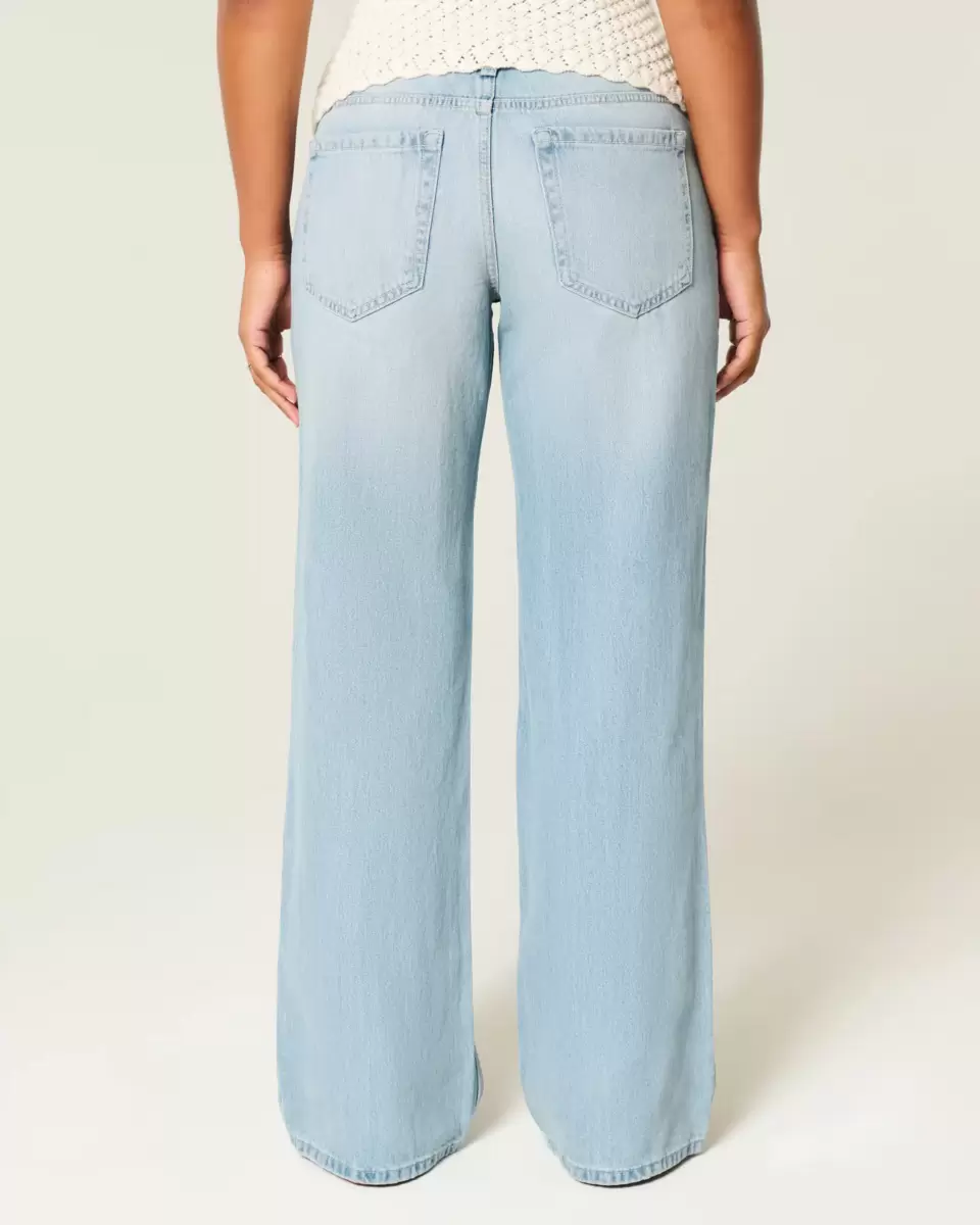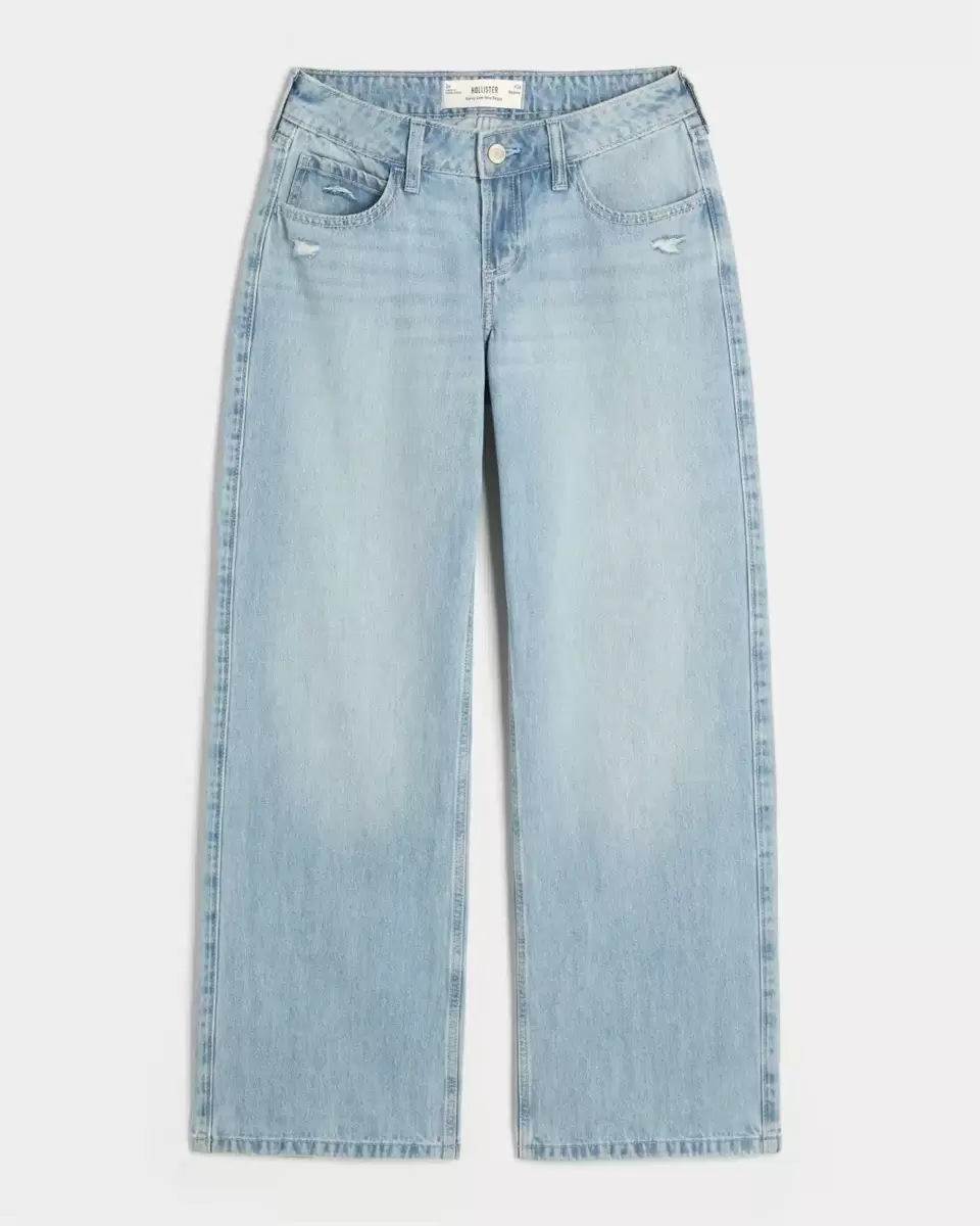 These comfy jeans are designed with a low-rise waist and baggy leg. Fading, whiskering, distressed details. Imported.