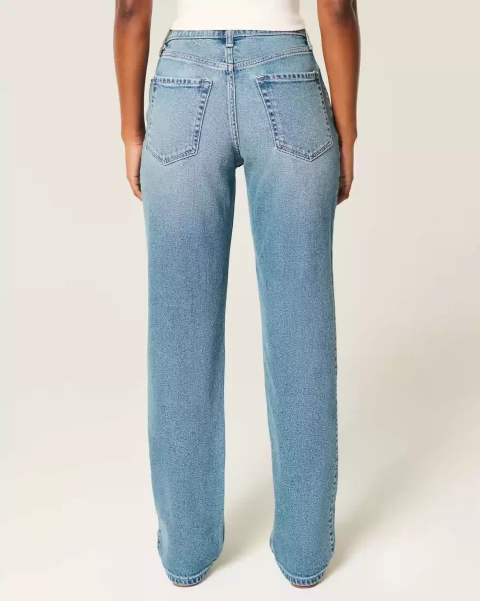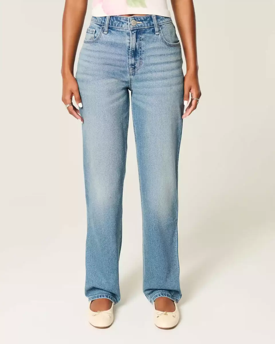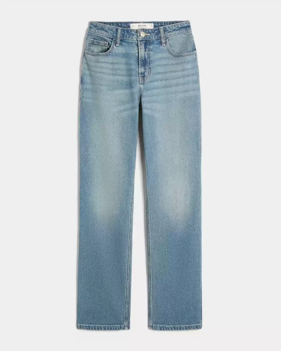 Comfortable denim jeans in medium wash, designed with a flattering high-rise waist and straight leg. Fading, whiskering. Imported.