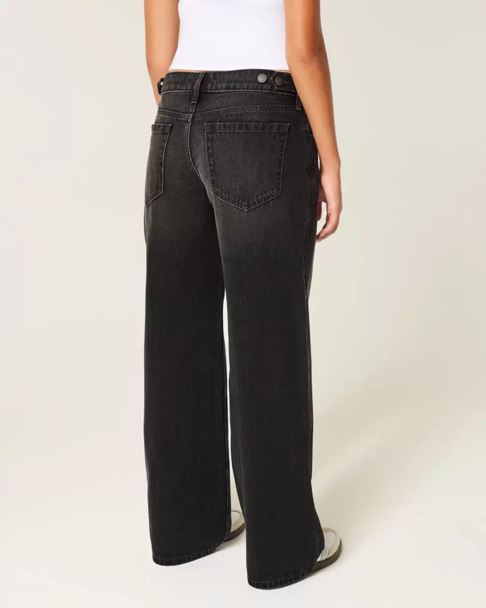 Comfortable denim jeans in washed black, designed with an adjustable low-rise waist and baggy leg. Fading. Imported.
