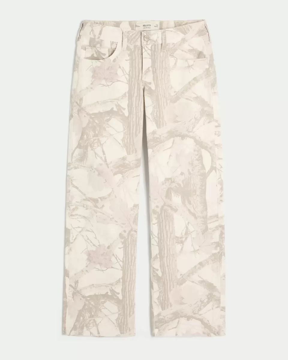 Comfortable denim jeans designed with a baggy leg and flattering low-rise waist. All-over camo pattern. Imported.