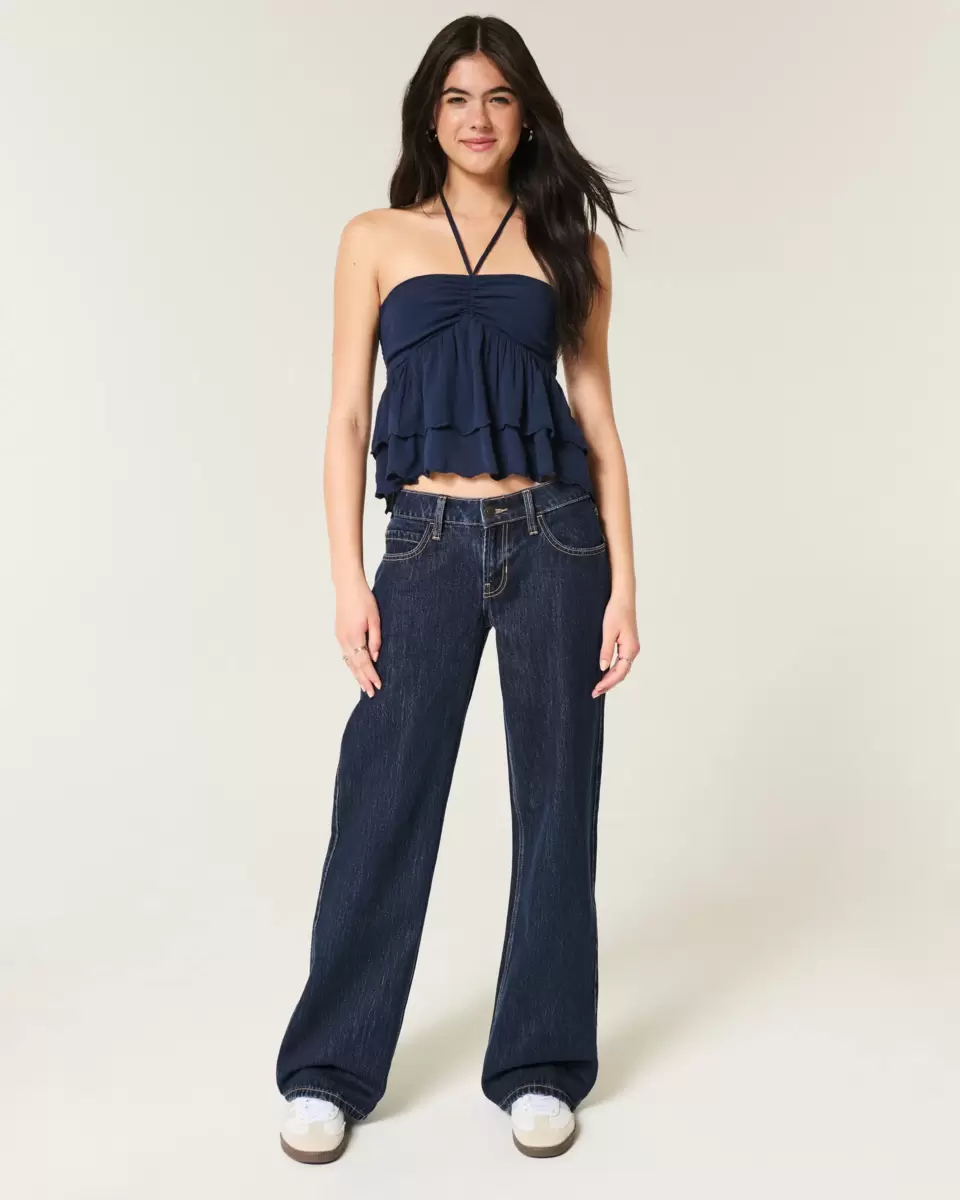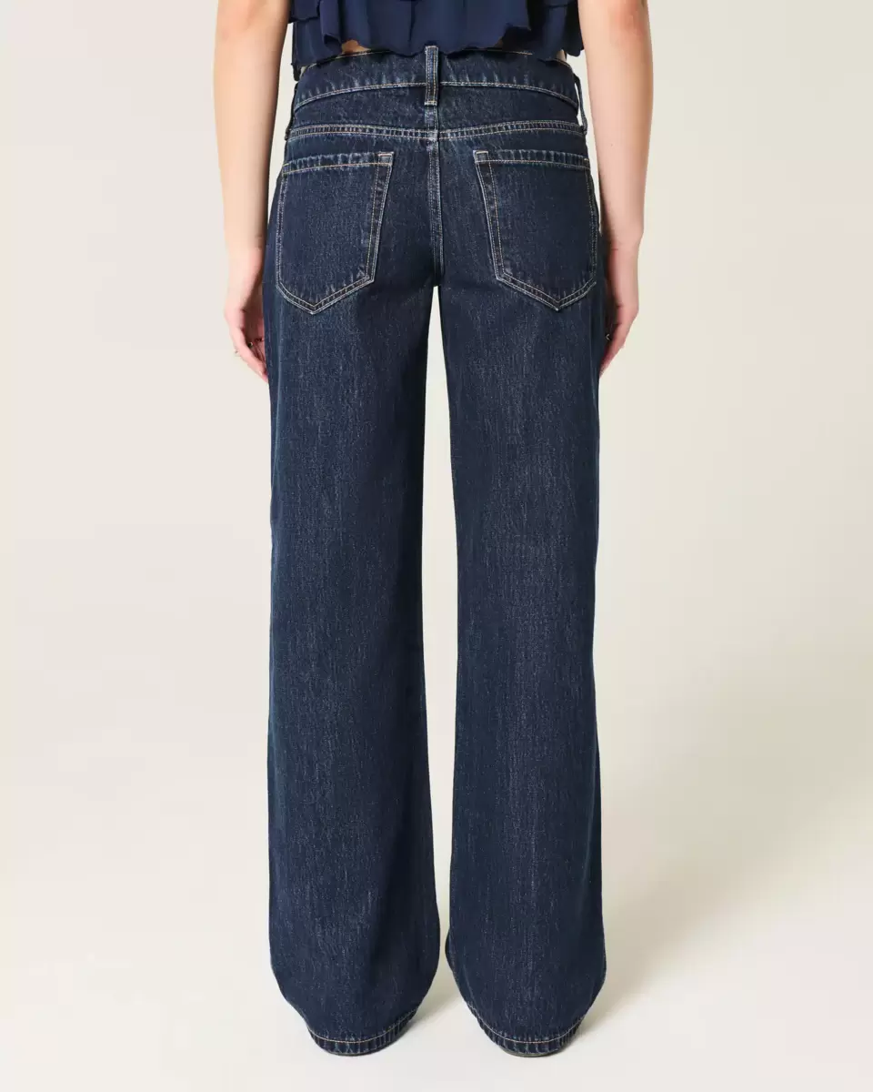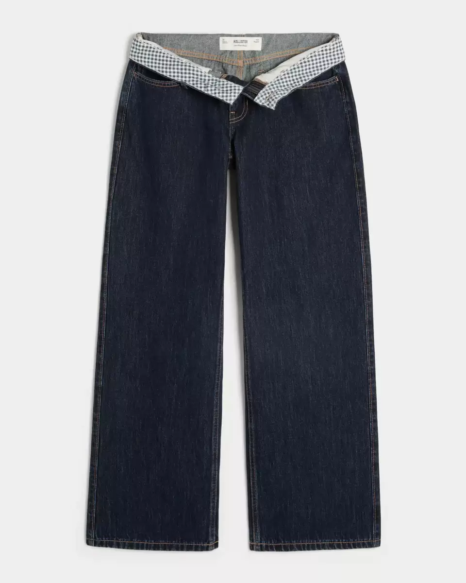 Comfortable denim jeans designed with a flattering low-rise waist and baggy leg. Foldover waistband with interior pattern, dark wash. Imported.