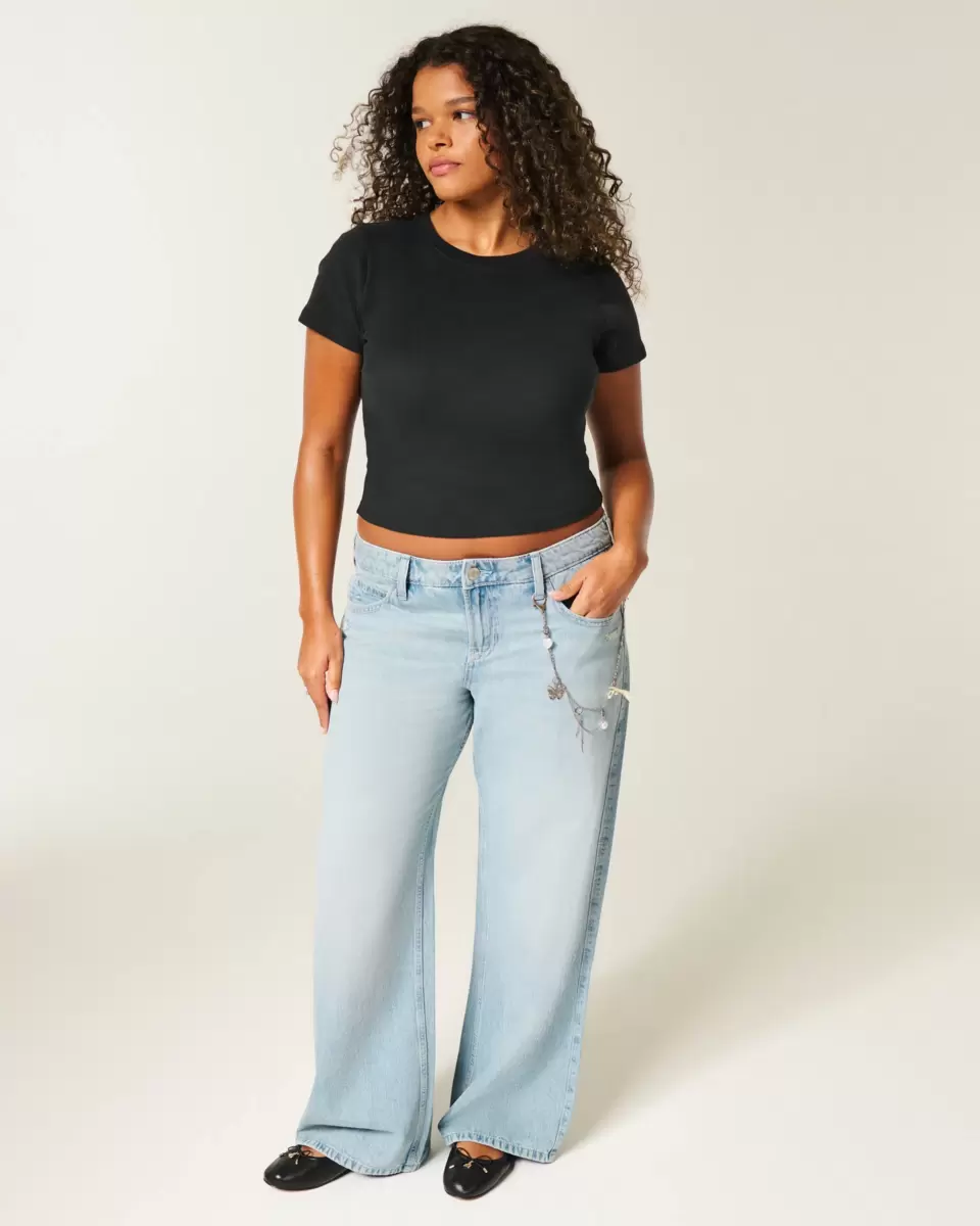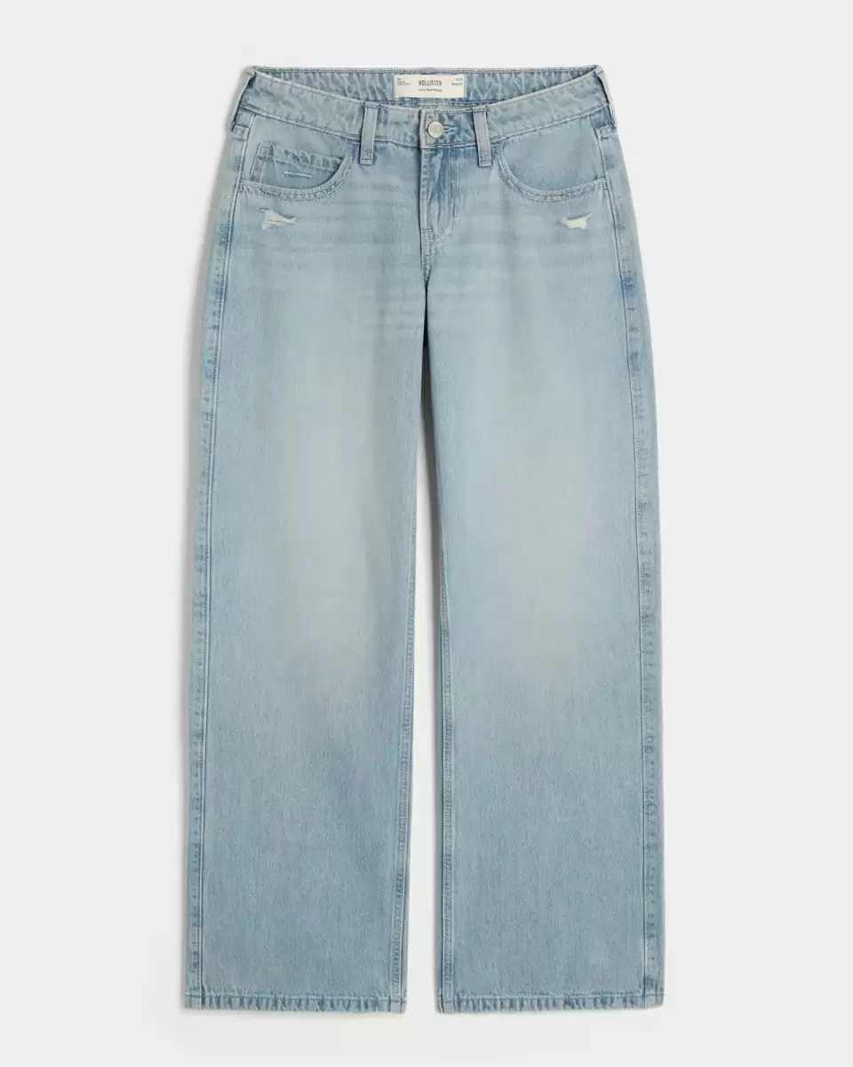 Comfortable denim jeans designed with a flattering low-rise waist and baggy leg. Fading, whiskering, distressed details. Imported.