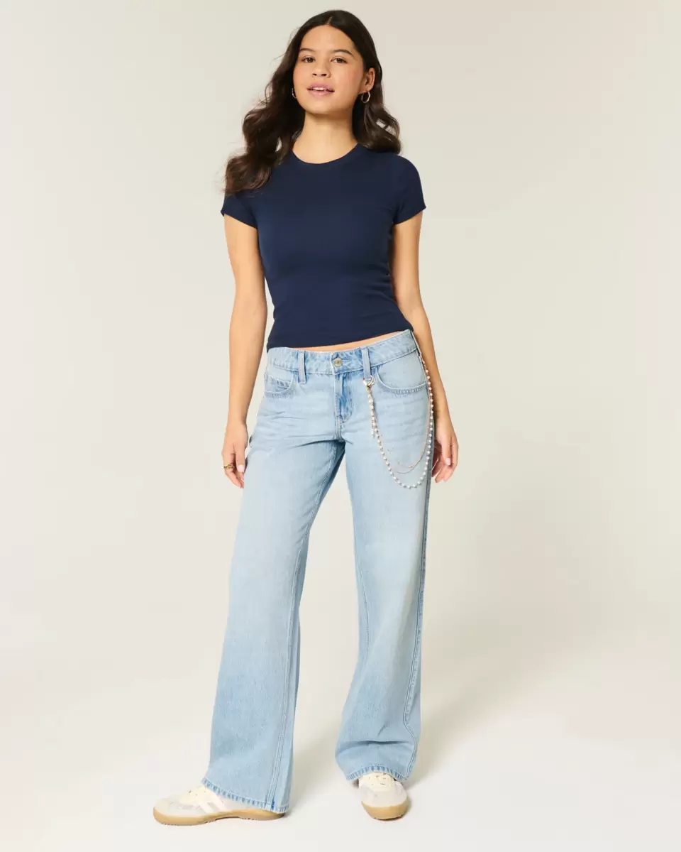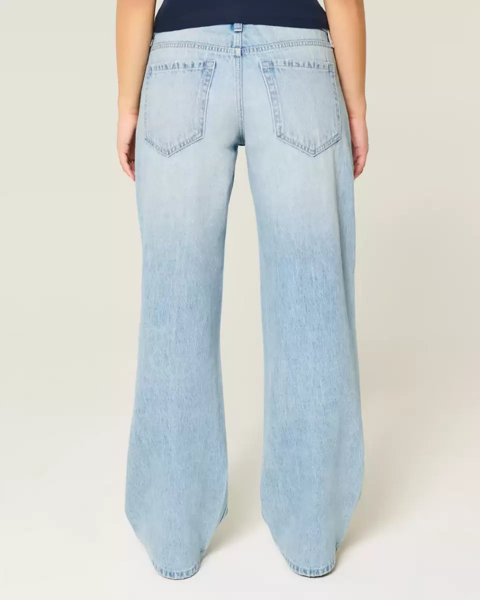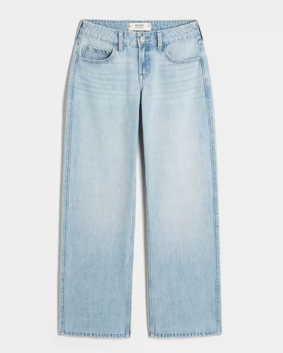 Comfortable denim jeans designed with a flattering low-rise waist and baggy leg. Light wash with fading and whiskering. Imported.