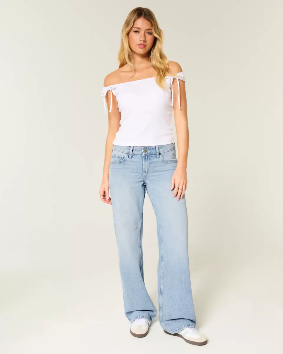 Comfortable denim jeans in a light wash, designed with a baggy leg and flattering low-rise waist. Cute metal studded bow details, fading, whiskering. Imported.