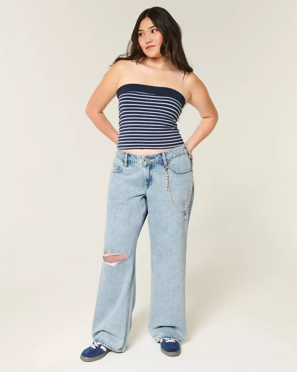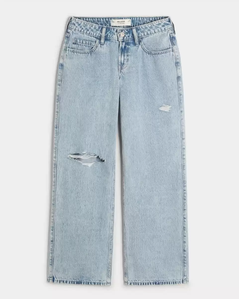 Comfortable denim jeans in a light wash, designed with a baggy leg and flattering low-rise waist. Ripped details. Imported.