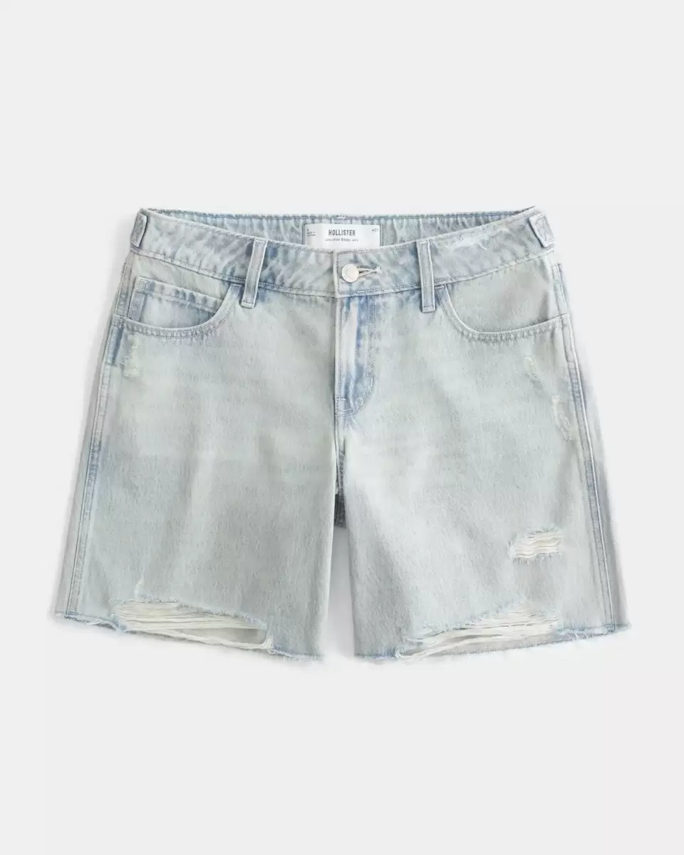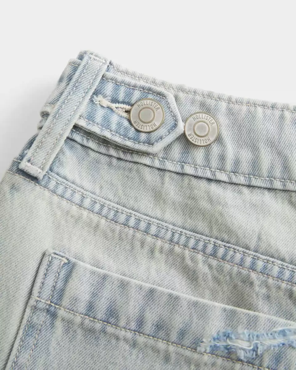 Cute and comfortable denim shorts in a light wash, designed with a baggy leg and adjustable waistband. 7″ inseam, low-rise waist. Imported.